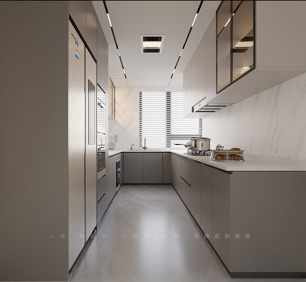 U型廚房設(shè)計,灰色地柜與米白色吊柜搭配,營造出雅致舒適氛圍。明確劃分功能區(qū)域,包括電器、儲物、洗菜、備菜和烹飪區(qū),工作流程更流暢高效。無拉手設(shè)計的吊柜簡潔獨(dú)特,便于使用,整潔美觀。大氣的巖板臺面耐用易打理,節(jié)省維護(hù)時間。充分利用內(nèi)部空間,儲存、操作、流動更便捷。