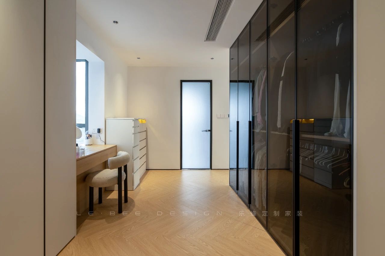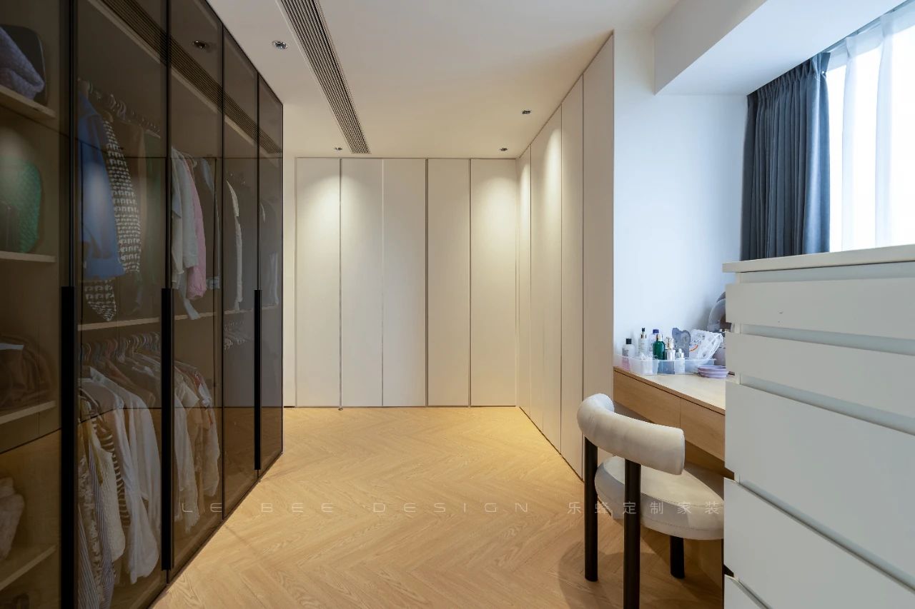 衣帽間布置了整排衣柜,米白色的柜門(mén)簡(jiǎn)潔大方。一旁擺放了梳妝臺(tái)和化妝柜,為生活帶來(lái)便利。背后的整排展示柜采用長(zhǎng)虹玻璃柜門(mén)設(shè)計(jì),增添了空間的現(xiàn)代感和開(kāi)放感,讓整個(gè)區(qū)域更加通透明亮,同時(shí)展示了家中精美的收藏品。