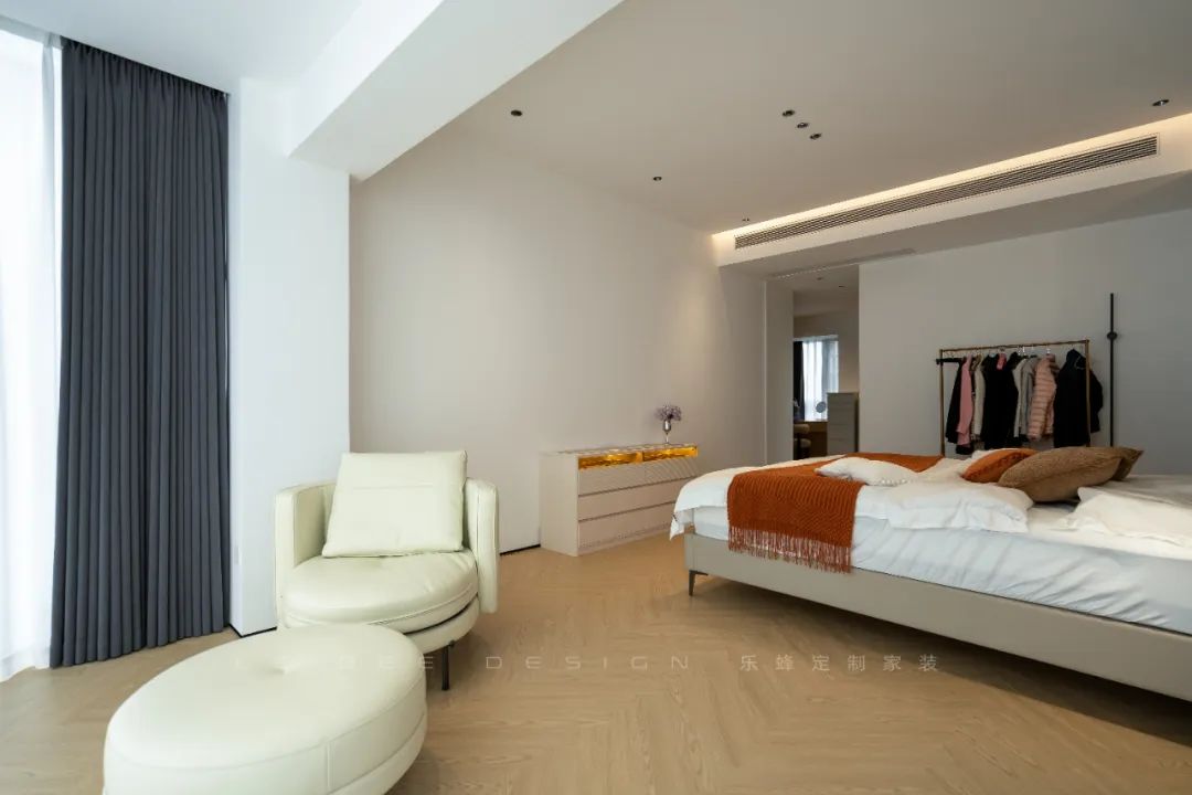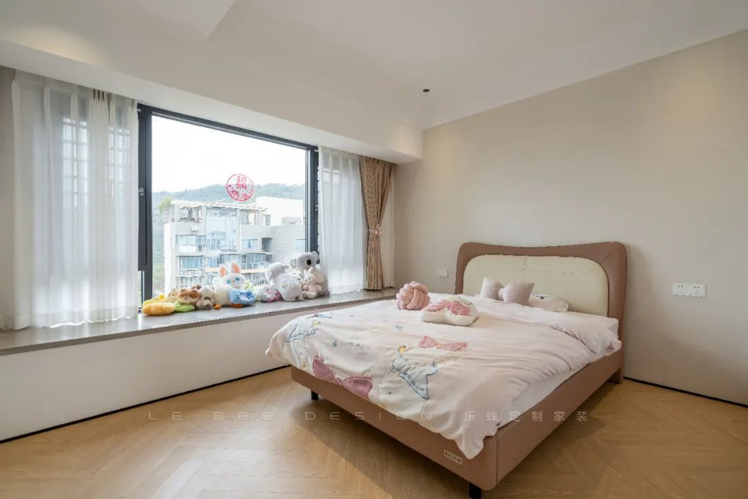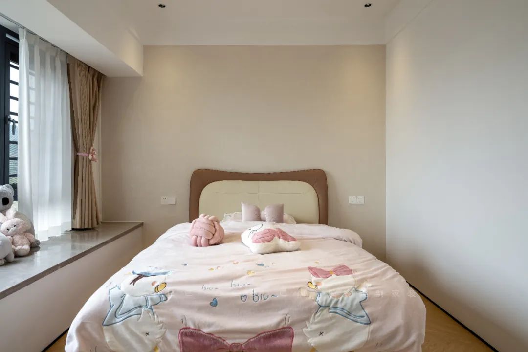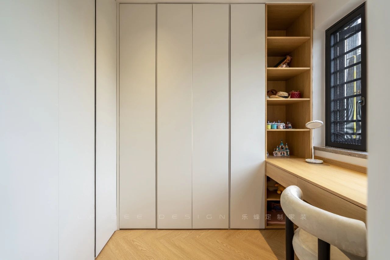 女兒房沒(méi)有過(guò)多復(fù)雜設(shè)計(jì),整體采用了米色乳膠漆,搭配成品床墊,注重了舒適和簡(jiǎn)約風(fēng)格。房間中放置了可愛(ài)的裝飾元素,為空間增添了溫馨氛圍。最有趣的設(shè)計(jì)是靠窗的位置,特意設(shè)計(jì)了一個(gè)小衣帽間,兼顧了儲(chǔ)物和衣物擺放的需求,同時(shí)也充分利用了空間。此外,衣帽間頂部延伸設(shè)計(jì)成懸浮書(shū)桌,既實(shí)現(xiàn)了辦公學(xué)習(xí)的功能,又增添了房間的靈活性和實(shí)用性。
