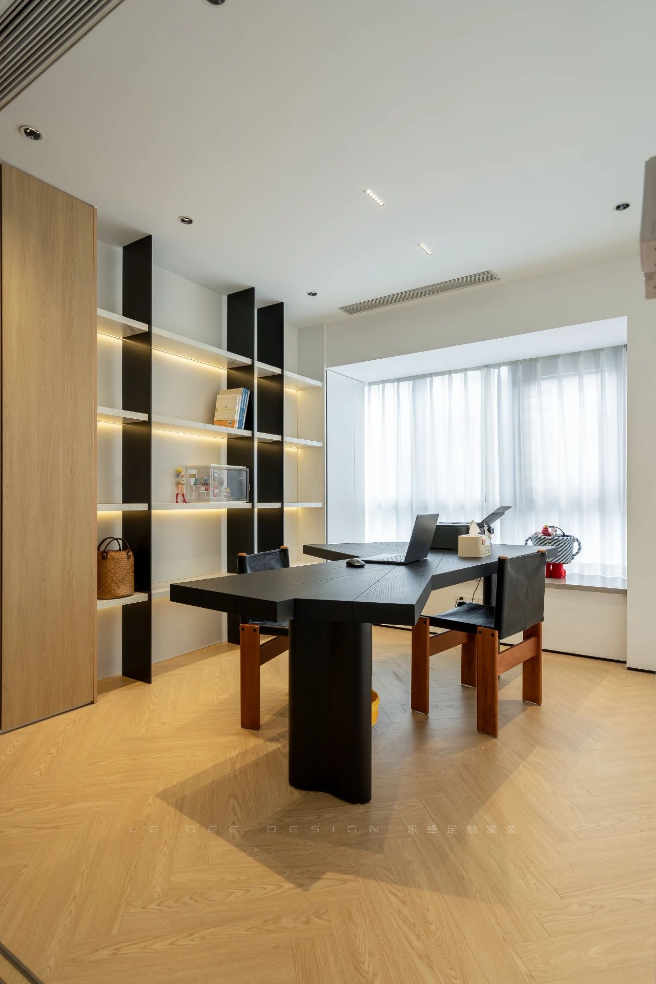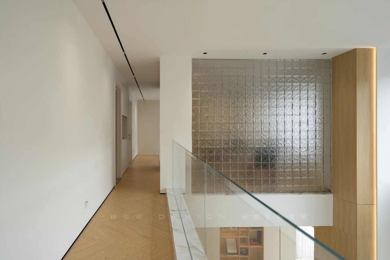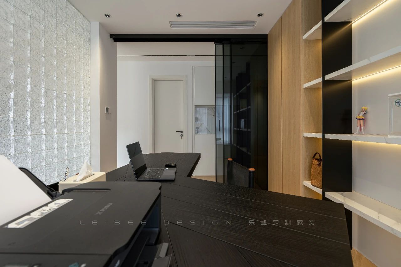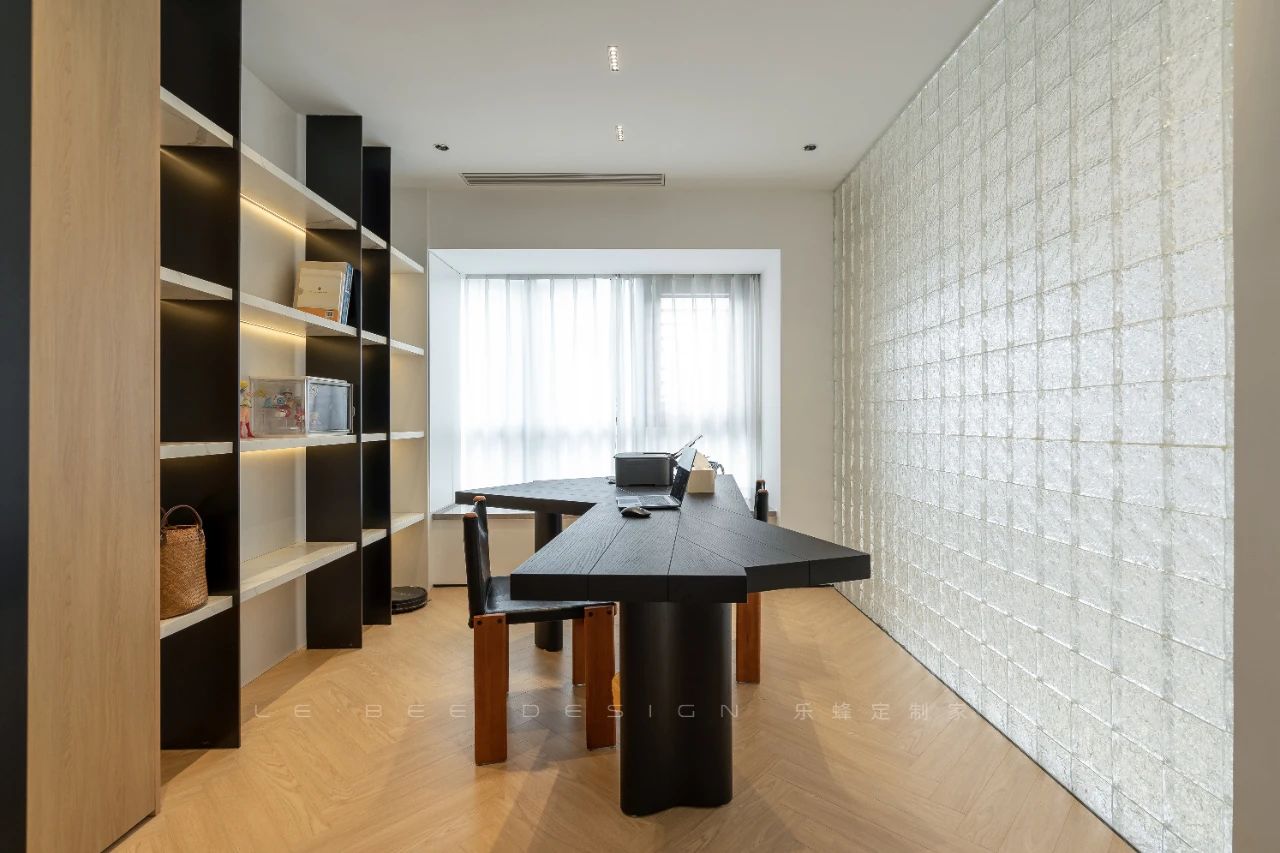 二樓書(shū)房的設(shè)計(jì)別出心裁,以背景墻打造展示柜,黑白拼接的設(shè)計(jì)賦予整個(gè)空間獨(dú)特格調(diào)。內(nèi)嵌燈帶更添設(shè)計(jì)感,為展示區(qū)營(yíng)造溫馨光影。黑色藝術(shù)烤漆茶桌與玻璃磚墻設(shè)計(jì)巧妙融合,陽(yáng)光透過(guò)玻璃磚灑進(jìn)茶室,溫暖的光線為空間增添了柔美的氛圍,烘托出茶室的溫馨與藝術(shù)氛圍,細(xì)膩的設(shè)計(jì)感仿佛將空間打造成一幅恬靜的畫(huà)卷,令人心馳神往。