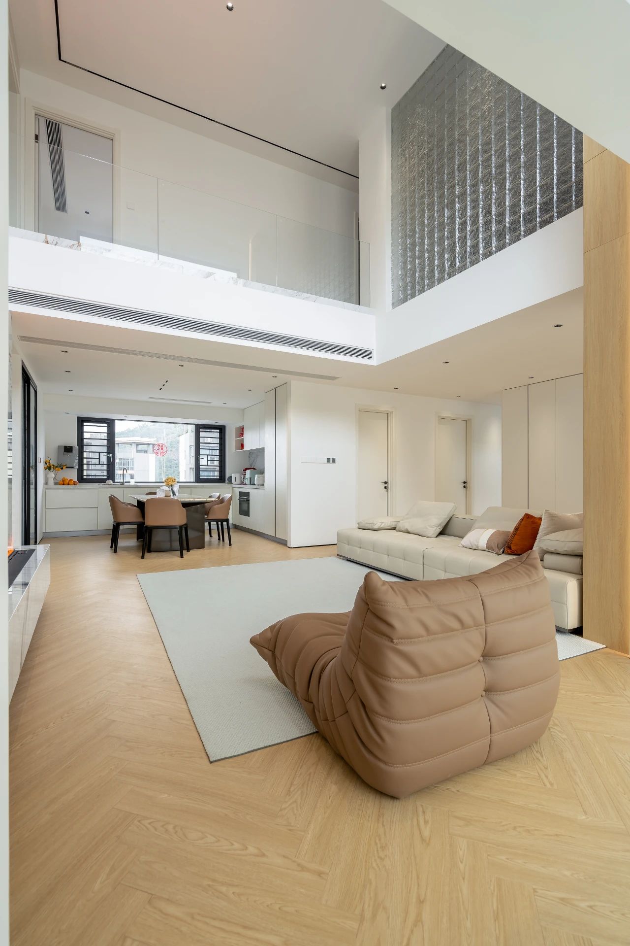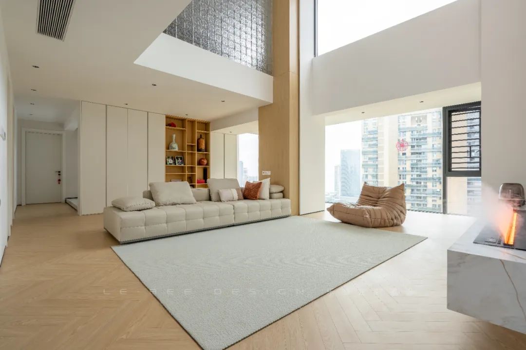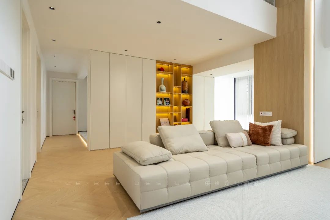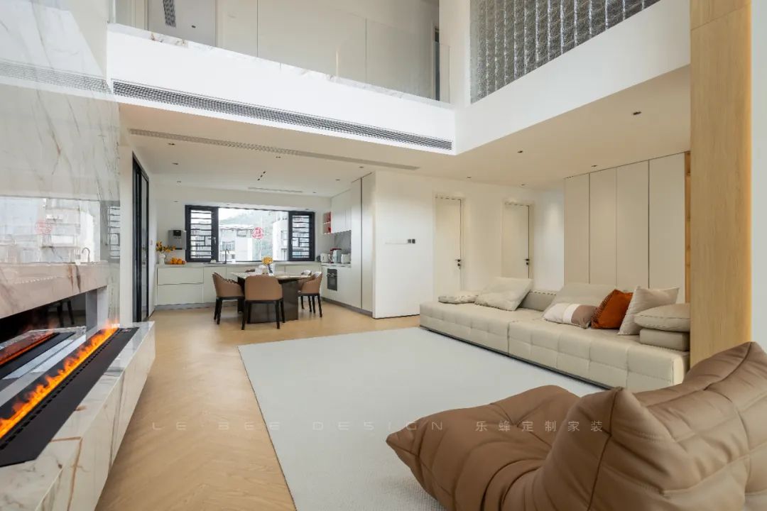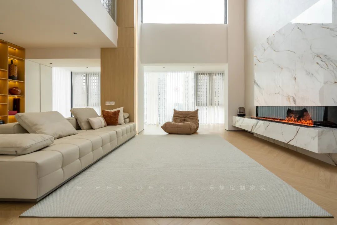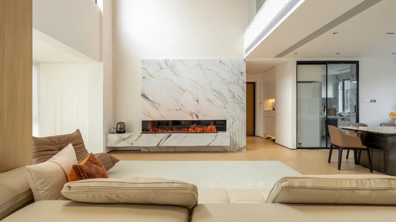 客廳的鏤空設(shè)計(jì)與巨大的窗戶相得益彰,使整個(gè)空間通透寬敞。優(yōu)雅的皮質(zhì)沙發(fā)進(jìn)一步提升了氛圍。人字形拼接的木地板與灰色地毯相互輝映,營(yíng)造出舒適而溫馨的氛圍。懸掛式電視背景墻搭配壁爐設(shè)計(jì),為空間增添了層次感和功能性。板墻水墨畫(huà)大理石巖板的設(shè)計(jì)則賦予整個(gè)空間典雅而富有品味的特色。沙發(fā)一旁的柱子與原木的氣息相互映襯,直立而端莊,與米白色的墻體相互拼接。柔光燈帶嵌入其中,營(yíng)造出森林般的氛圍。背后的整排收納柜設(shè)計(jì)巧妙,拼色的展示柜可展示業(yè)主鐘愛(ài)的古董等物品,而嵌入燈帶的設(shè)計(jì)又為整個(gè)空間注入新的活力。