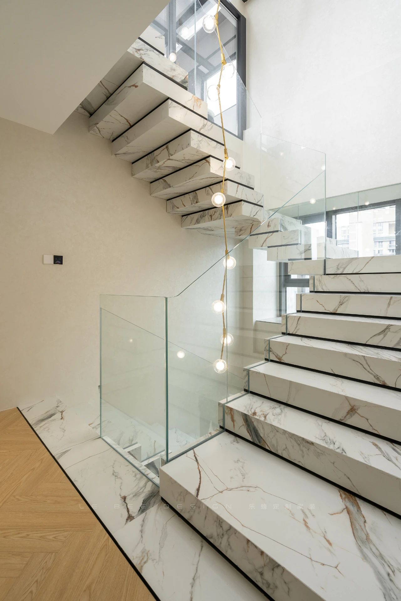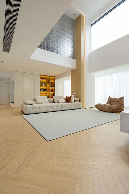 樓梯采用白色的巖板,搭配12厘米的超白鋼化玻璃。踏步立面采用白色的巖板,增加了空間整體的層次感,采用內(nèi)嵌卡槽的形式,以確保銜接和收口的完美,同時(shí)增強(qiáng)了承重能力。此外,提前預(yù)留了燈源,并采用了“光感+人體感應(yīng)”的設(shè)計(jì),實(shí)現(xiàn)了“人來(lái)燈亮,人離燈熄”的智能控制。在光線暗的情況下,燈感應(yīng)到人體,呈現(xiàn)出層層梯進(jìn)的追光效果,既照亮了樓梯,又提升了美感。