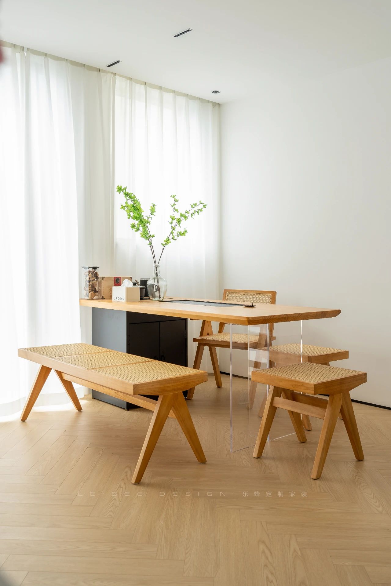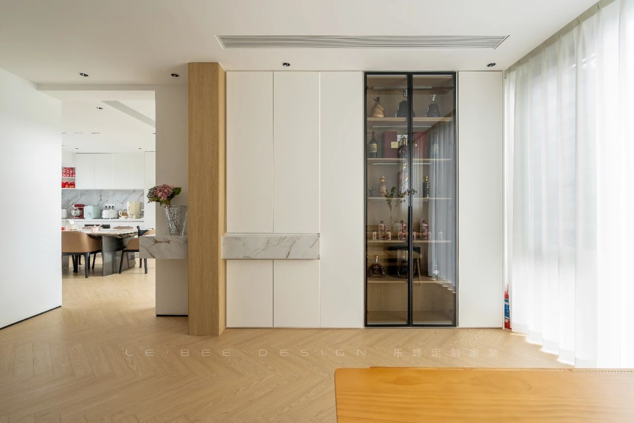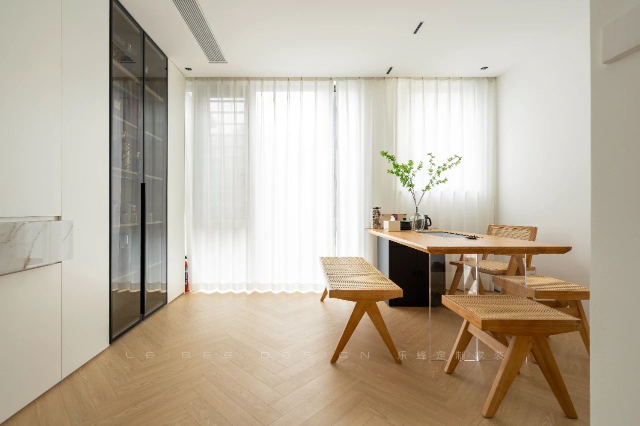 入戶玄關(guān)簡(jiǎn)約而溫馨,景端設(shè)計(jì)讓人一見(jiàn)之下便被綠植所吸引,仿佛清新的大自然近在眼前。原木與大理石的完美搭配營(yíng)造出獨(dú)特的藝術(shù)氛圍,同時(shí)也增強(qiáng)了私密性。懸空設(shè)計(jì)的鞋帽柜不僅方便清潔,還能方便更換鞋履。原木的隔斷延伸至兩旁的大理石懸浮臺(tái)面,衍生出米白色的收納酒柜。長(zhǎng)虹玻璃門(mén)設(shè)計(jì)既實(shí)現(xiàn)了收納酒品的功能,又使整個(gè)空間更加豐富多彩,避免了單調(diào)。創(chuàng)造一個(gè)深邃靜謐的茶室空間,將自然之美與人文情懷巧妙融合,呈現(xiàn)出一場(chǎng)內(nèi)心深處的靜心之旅。以白色調(diào)為底色,仿若潔白的畫(huà)布,原木色則勾勒出歲月的痕跡,展現(xiàn)出大自然的生命力與歲月的沉淀。木制茶臺(tái)的線條簡(jiǎn)潔流暢,原木紋理的展示如詩(shī)如畫(huà),營(yíng)造出恰到好處的雅致氛圍。燈光的設(shè)計(jì)如同一場(chǎng)視覺(jué)的舞蹈,與自然光線交相輝映,打造出恰到好處的溫馨與舒適。茶室不僅是品茶的場(chǎng)所,更是心靈的驛站。我們希望通過(guò)設(shè)計(jì),營(yíng)造出一個(gè)遠(yuǎn)離喧囂的靜謐之境,讓人們?cè)谶@里找到內(nèi)心的平靜與安寧,感受到生活中最純粹的美好。