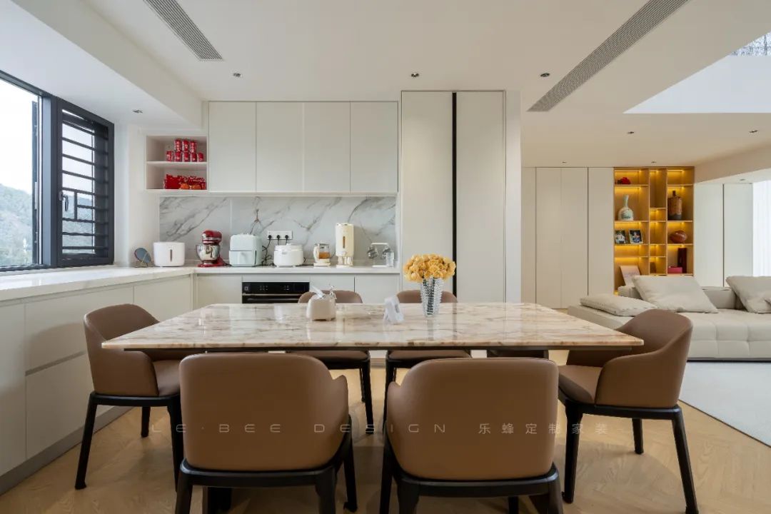 餐廳位置,L型吧臺(tái)區(qū)域采用淺米色門(mén)板,搭配灰色踢腳線作為點(diǎn)綴,以簡(jiǎn)潔而精致的設(shè)計(jì)風(fēng)格為特色。免拉手設(shè)計(jì)讓整體空間更加簡(jiǎn)約流暢,門(mén)板延伸至頂部,打造統(tǒng)一的視覺(jué)效果。水墨淺橙色的巖板桌面與深橙色的椅子相得益彰,為空間增添了一抹獨(dú)特的色彩,營(yíng)造出現(xiàn)代、時(shí)尚的餐廚氛圍。