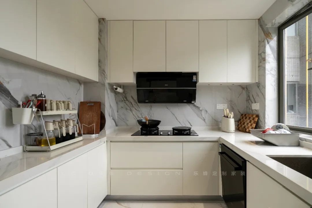 廚房選用了U型布局,頂部全線吊柜采用米白色門(mén)板,中央置入油煙機(jī),使廚房空間展示出潔凈與雅致。下部的U型設(shè)計(jì)將煮菜區(qū)、洗滌區(qū)和儲(chǔ)藏區(qū)巧妙隔離,有機(jī)劃分功能場(chǎng)所,讓廚房工作線路更加明晰有序。