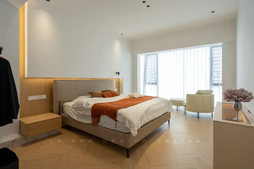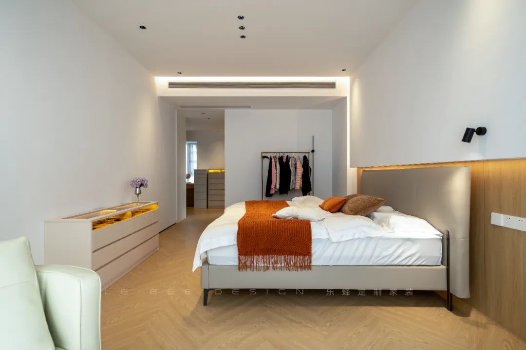 臥室采用無(wú)主燈設(shè)計(jì),射燈主要用于重點(diǎn)照明,吊燈則用于裝飾空間,而燈帶則為氛圍燈光增添溫馨氣氛。床頭的護(hù)墻搭配線性燈提升了整體高級(jí)感。傳統(tǒng)的床頭柜被取消,木作大多以原木色為主,背景墻采用凹凸設(shè)計(jì),原木巖板上墻并嵌入燈帶,增強(qiáng)了空間的層次感。床品以淺色為主,簡(jiǎn)潔舒適。休息區(qū)的設(shè)計(jì)以黑白棕色為主調(diào),突顯出房間的高級(jí)質(zhì)感和品味。床尾玩鬧的小貓裝飾細(xì)節(jié)則為整個(gè)空間注入了一絲趣味與活力,使人們?cè)谛菹r(shí)感受到更加舒適和愉悅。主衛(wèi)以大面積的大理石灰為主基調(diào),展現(xiàn)出飽滿的質(zhì)感和高級(jí)感。冷色系與暖色燈光相得益彰,營(yíng)造出舒適宜人的氛圍。洗漱區(qū)采用木質(zhì)浴室柜搭配智能鏡柜,美觀大方,同時(shí)抽屜式和開(kāi)放式儲(chǔ)物設(shè)計(jì)豐富了洗漱區(qū)的收納空間。干濕分離設(shè)計(jì)采用長(zhǎng)虹玻璃隔斷,實(shí)現(xiàn)了空間的合理利用和功能分區(qū)。