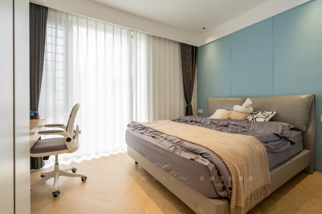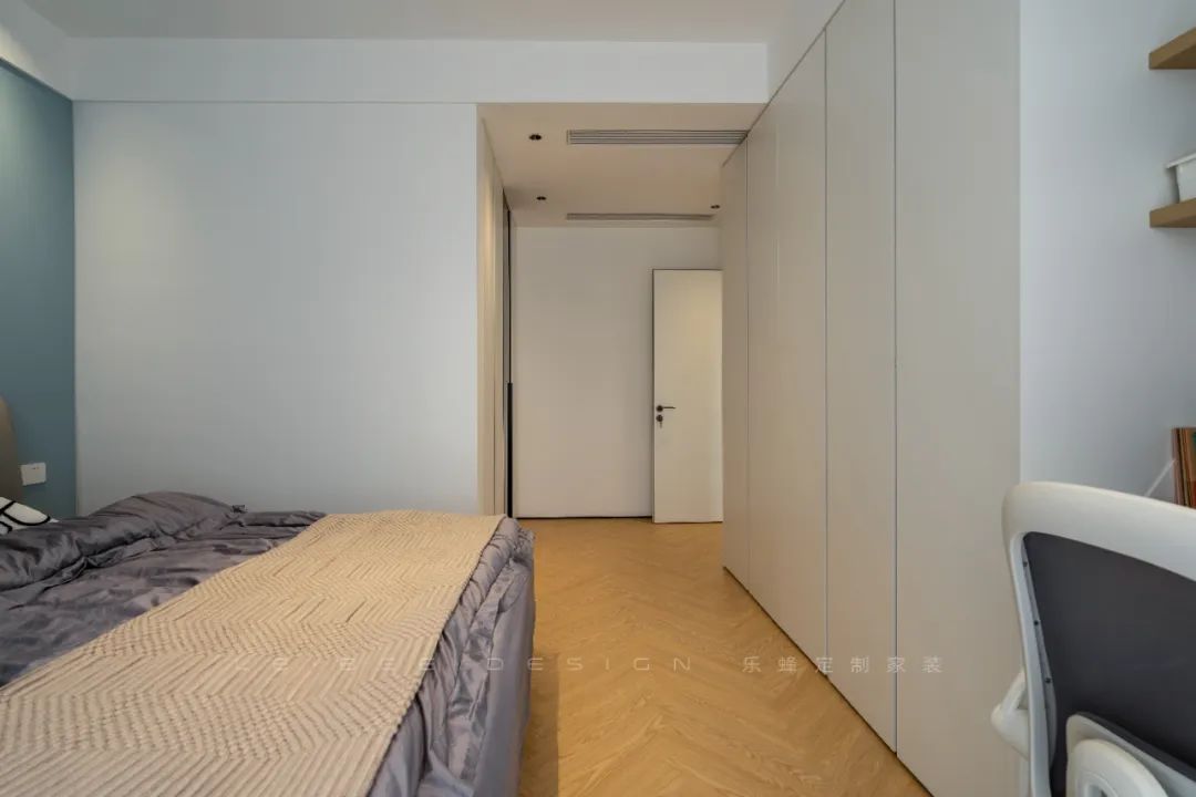 進(jìn)門(mén)右側(cè)是一門(mén)到頂?shù)囊鹿瘢院?jiǎn)潔大方的米白色柜門(mén)設(shè)計(jì),充分利用空間,提供了豐富的存儲(chǔ)選項(xiàng),同時(shí)為整個(gè)房間增添了清爽的視覺(jué)效果。男孩房以清新舒適的藍(lán)色背景墻和簡(jiǎn)約的單眼皮吊頂為特色,搭配現(xiàn)代風(fēng)格的成品床及淺色系床上用品,展現(xiàn)出精心設(shè)計(jì)的空間感。此外,特別設(shè)計(jì)了實(shí)木懸浮書(shū)桌,為空間增添了自然的元素,讓整個(gè)空間更加溫馨舒適。