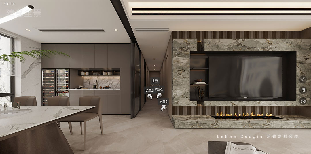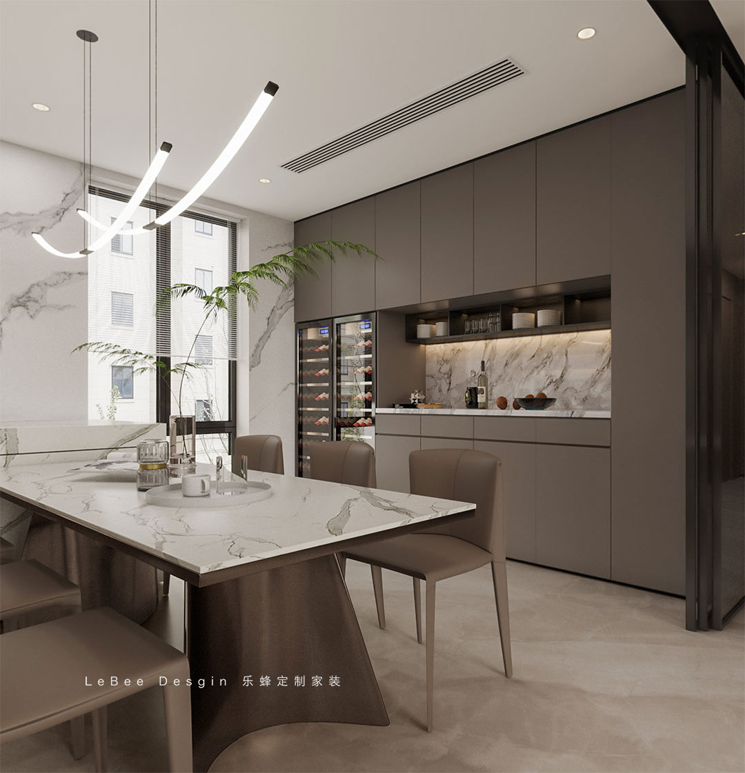整個空間采用開放式的格局,通過黑白灰關系來講室內的氣質升華,用深色的石材和金屬來進行輔佐,讓空間更加有節奏和干練。開放式的布局讓此處空間擁有了更加高調的格局,游走在室內的除卻一些精美的藝術家具以外,還有各類材質,材質之間的不同質感交相融合,打造了獨屬于此處的豐盈美感,黑白灰三色的融合,恰好足以詮釋空間的優越質感。乍一看,空間的柔和似乎是與生俱來一般,實則在這之中一直蘊藏著設計師的小心機。