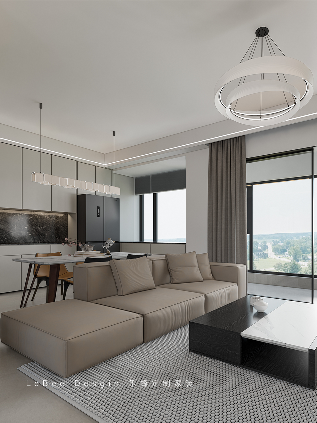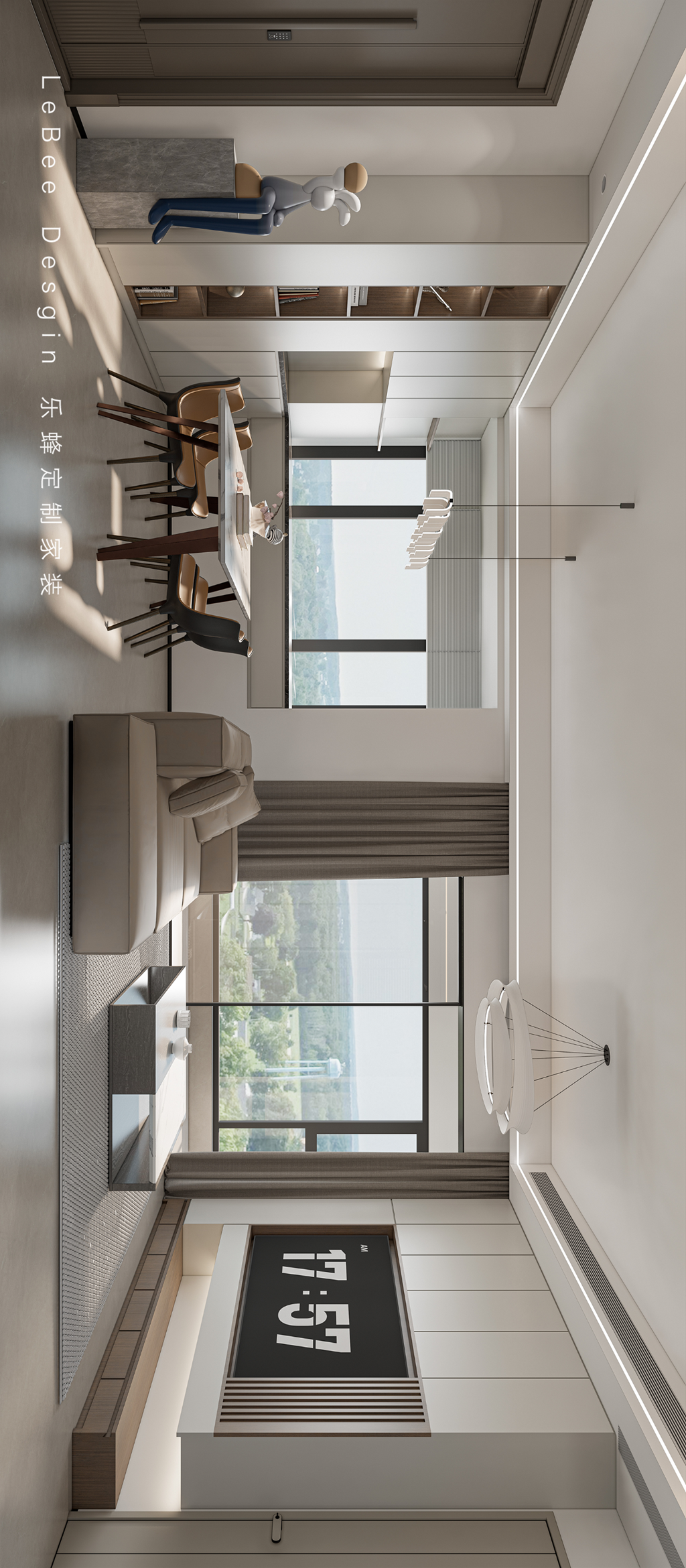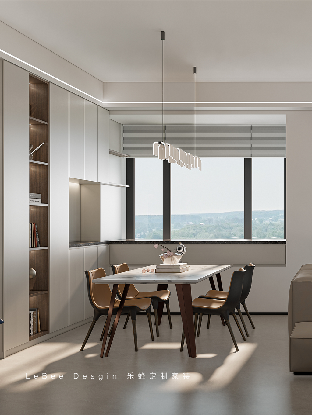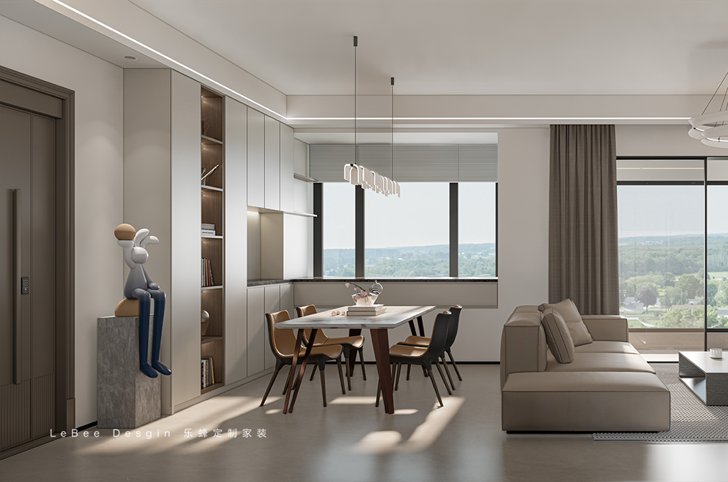 客餐廳及橫廳設(shè)計,以光為畫布,以自然為伙伴,將光線與風(fēng)景引入室內(nèi)。落地窗的設(shè)計不僅增強了采光,也極大地拓展了觀景視野,為您帶來戶外的美妙景致。多功能空間的構(gòu)思旨在提升生活的便捷性,同時也為家庭成員提供了互動交流的理想場所。室內(nèi)整體硬裝以簡約為基調(diào),避免了復(fù)雜的造型與裝飾,簡明的線條讓整個空間更顯廣闊而明亮。留白的設(shè)計哲學(xué)呼應(yīng)了極簡主義,營造出一種純粹而寧靜的環(huán)境,為您的生活帶來寧靜與舒適。電視墻的設(shè)計以現(xiàn)代簡約為出發(fā)點,融入溫馨的米色木飾面,為客廳注入了一縷溫暖氛圍。收納柜的設(shè)計巧妙內(nèi)嵌了電視機,整齊劃一,讓視覺焦點自然而然地聚焦于影音娛樂之上,同時也提供了額外的儲物空間。