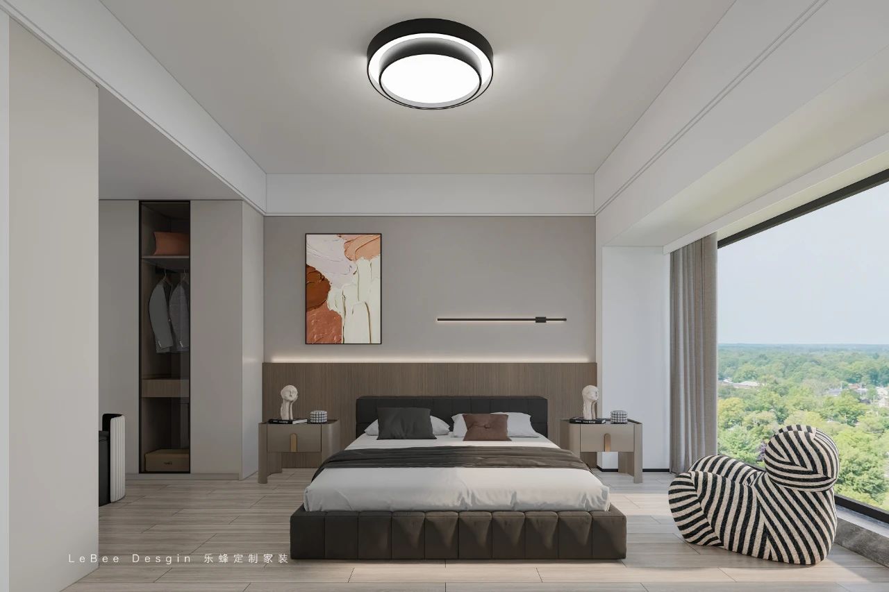 在功能與美學(xué)都同樣重要的主臥套間,陽臺梁面采用層級處理,不僅豐富了空間的層次,也增強了房間的立體感和視覺美。與此同時,工字木紋磚賦予空間自然休閑的氣息,為居住者提供了一個放松和安逸的休憩環(huán)境。此外,細節(jié)上通過線性燈帶點綴,增添了設(shè)計感,同時也不失舒適度,實現(xiàn)了審美與實用間的恰好平衡。