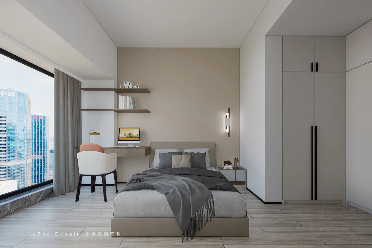 次臥壁面采用溫馨的米色乳膠漆,打造出一個寧靜舒適的休息空間。墻邊的懸浮書桌設(shè)計簡潔而充滿巧思,不僅節(jié)約空間,還能作為床頭柜的完美替代。地面選用了工字形木紋磚,賦予空間以自然的觸感和視覺美感,使整個次臥既實用又雅致。