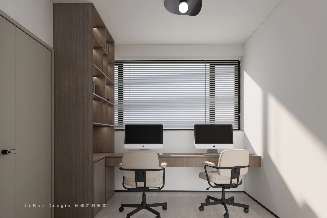書房的設(shè)計融合了充裕的儲物空間和簡潔的風(fēng)格,滿墻的儲物柜讓收納變得高效又隱蔽,保持了空間的整潔和有序。懸浮式的書桌增加了現(xiàn)代感,同時也節(jié)省了地面空間,使得整個書房更加寬敞。