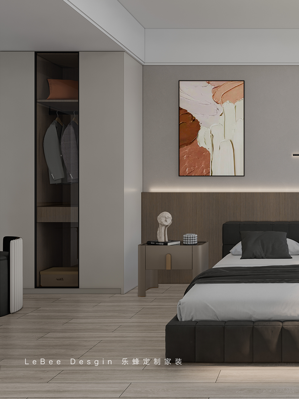 主臥采用套房的設(shè)計,床頭采用木飾面背景搭配米灰乳膠漆,不僅增加了房間的溫暖質(zhì)感,也展現(xiàn)出質(zhì)樸與現(xiàn)代的融合。