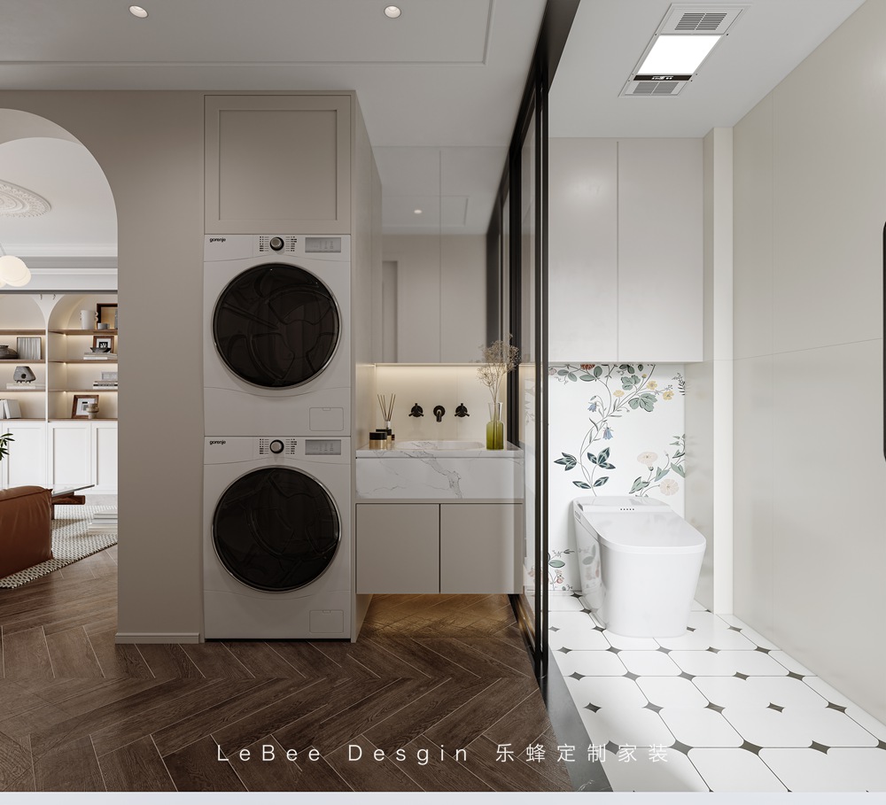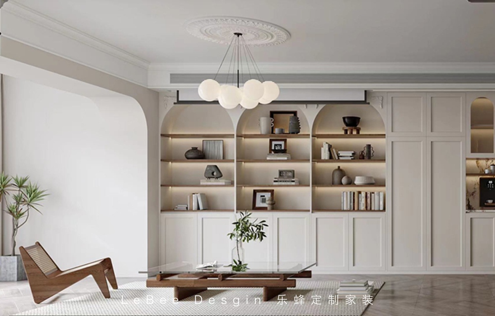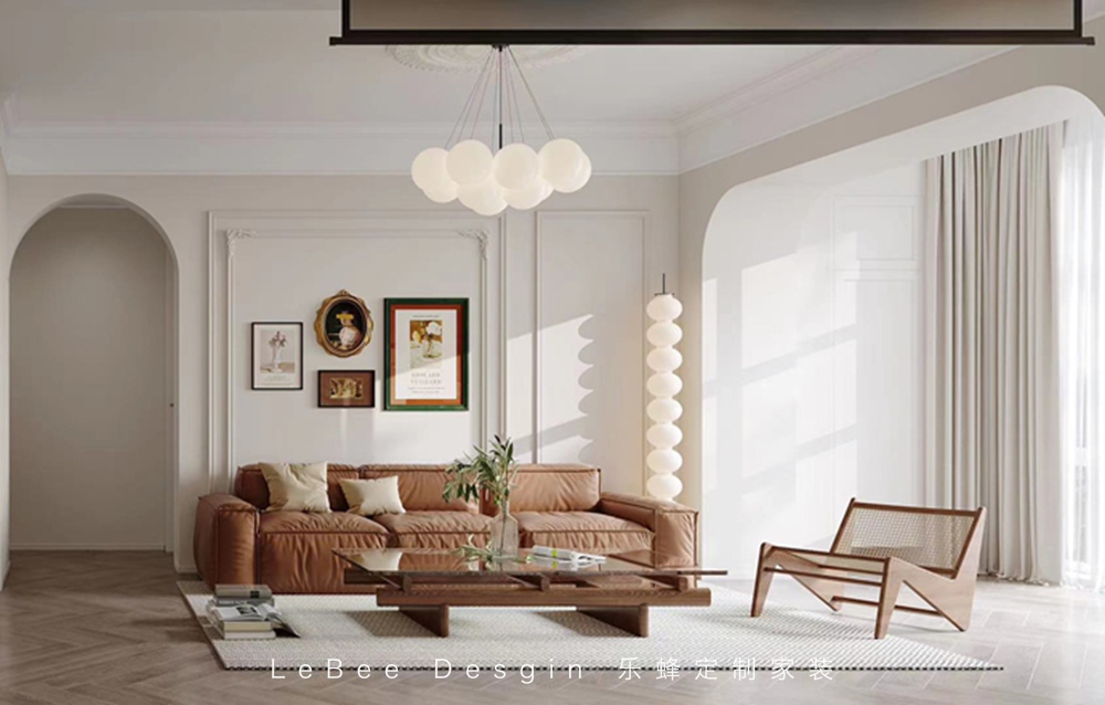 在客廳設計中,我們采用了大面積奶白色調,以及中古風家具,強調空間的通透感和層次感