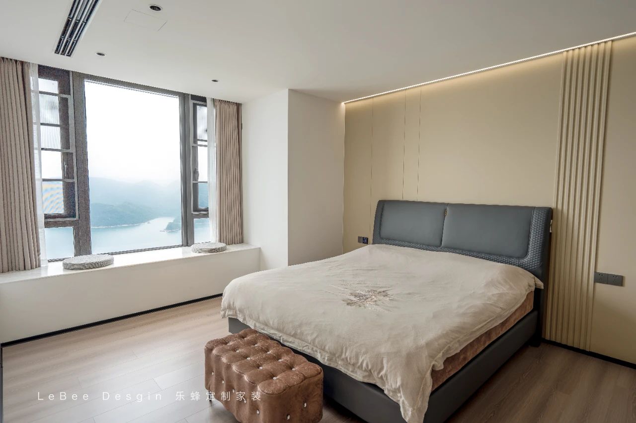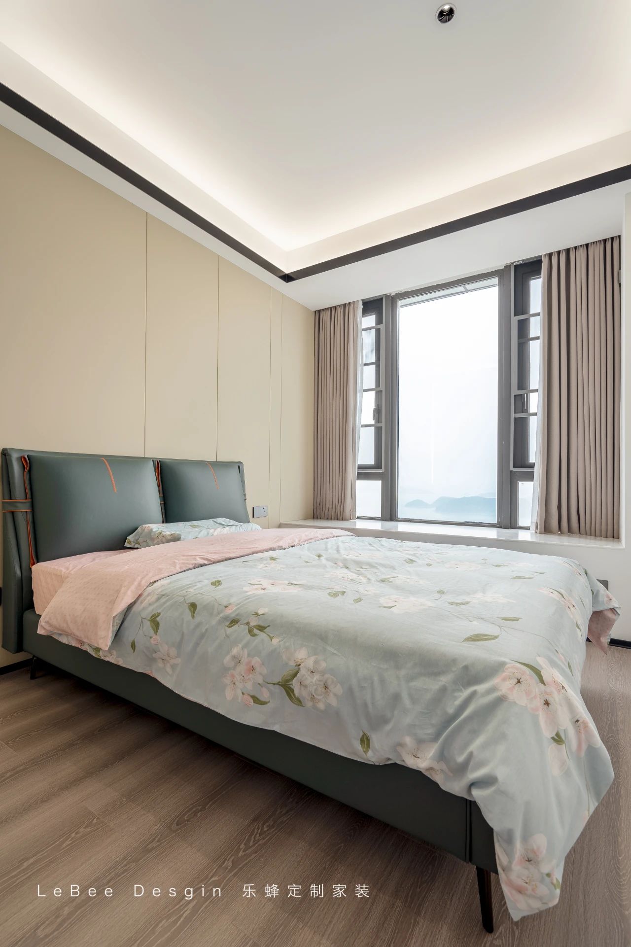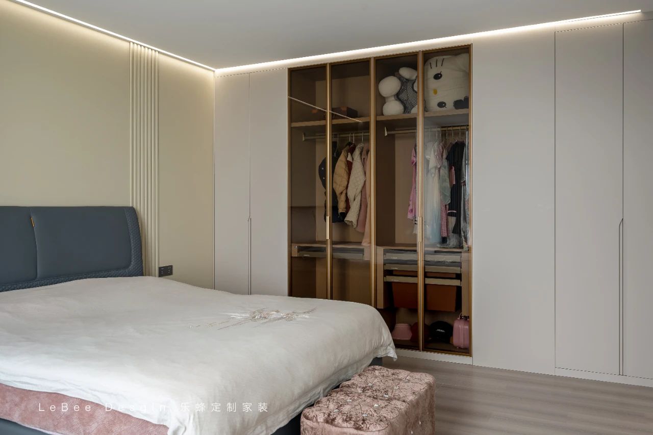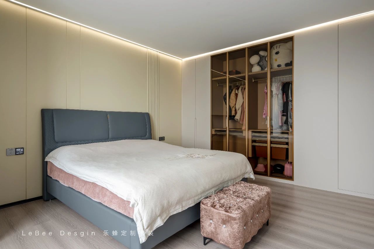 - 主臥實景圖 - 主臥采用淺色的木飾面上墻,木格柵的精心點綴與木飾面相輔相成,極具設計感。懸浮吊頂內嵌燈帶使整個空間在增添了濃郁氛圍感的同時,衣櫥整體的獨特設計又讓整個空間的氛圍感直接拉滿,展現出別樣的魅力與格調。