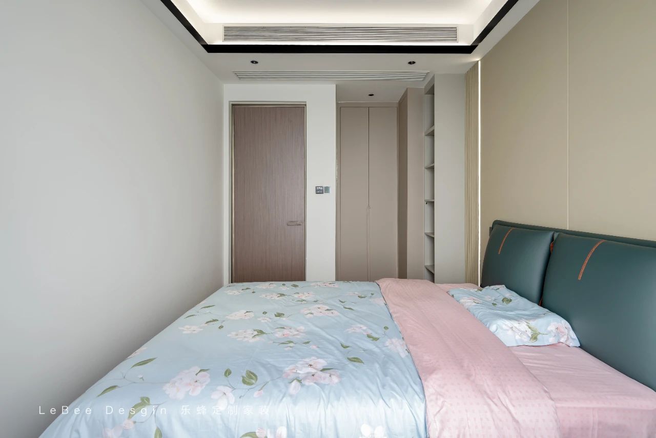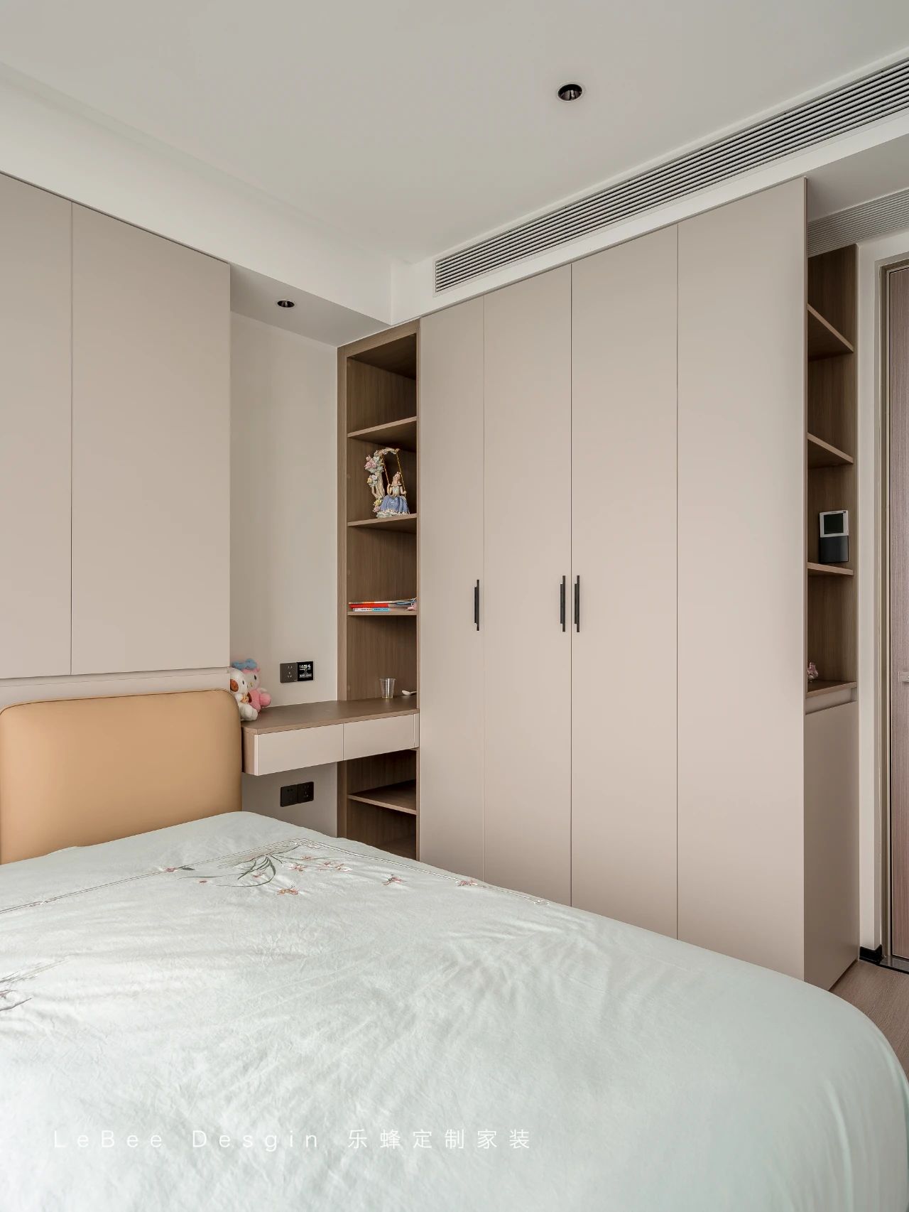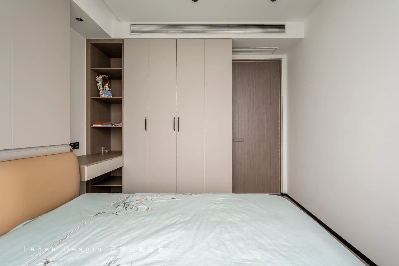 - 次臥實景圖 - 次臥的設計確實別具特色。單眼皮吊頂簡潔大方,與整體暖色調相得益彰,營造出溫馨舒適的氛圍。定制的一門到頂衣櫥設計不僅在外觀上顯得大氣美觀,而且極大地增加了收納空間,讓房間更加整潔有序。
