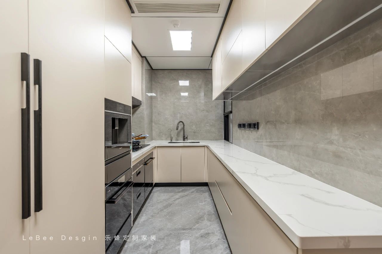 - 廚房實景圖 - 廚房采用了U型設計,空間利用非常合理,櫥柜采用了奶咖色,營造出清新自然的氛圍,墻壁則采用了淺色調,讓整個空間更加明亮通透,門面沒有做拉手,極簡設計視覺效果更好!