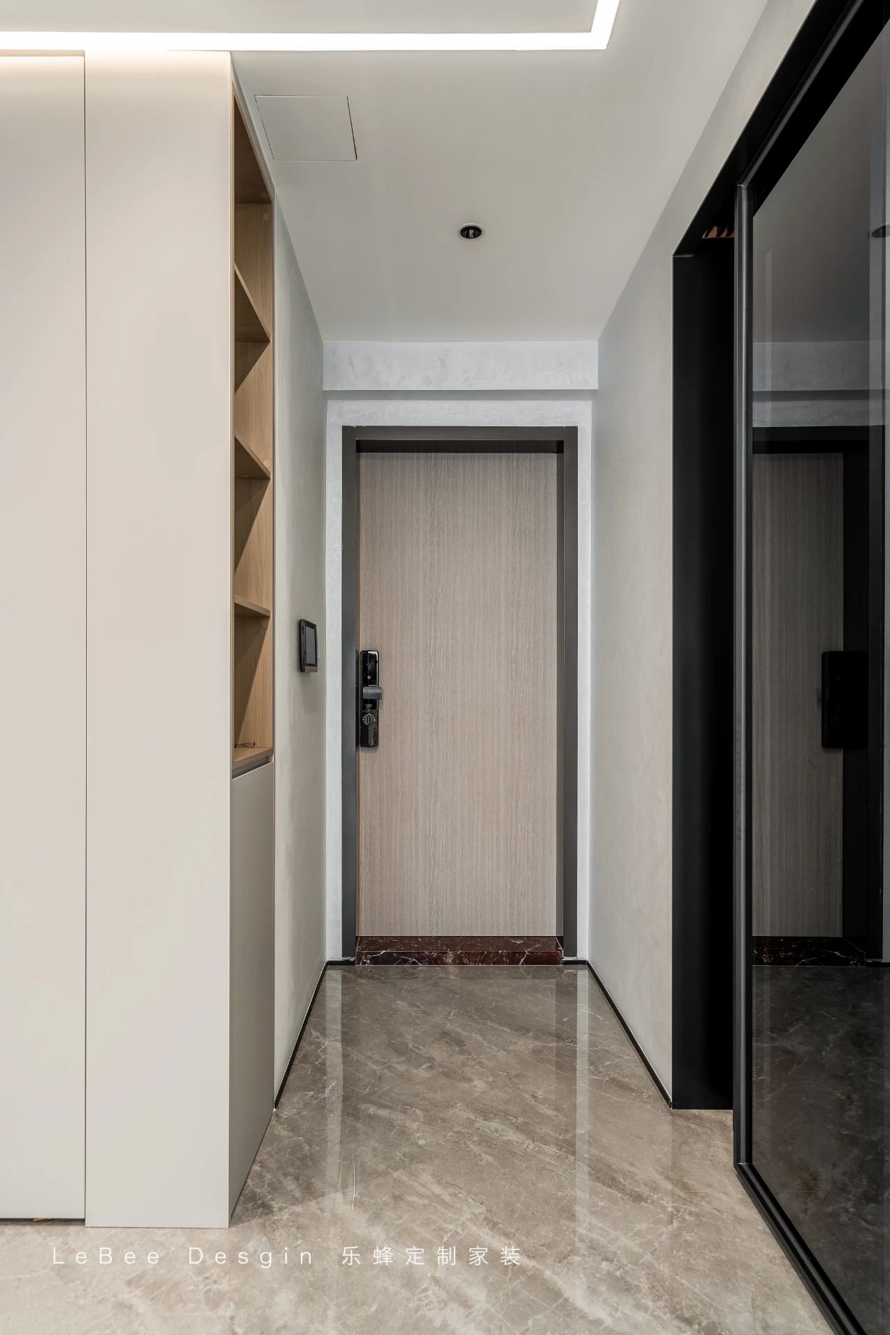 - 入戶玄關以通鋪淺灰色瓷磚搭配深橙色大理石瓷磚過門石,簡潔中凸顯色彩對比,加上開放式餐邊柜,呈現出簡約而具輕奢感的設計風格,沒有過多復雜設計卻盡顯獨特氛圍與品味。