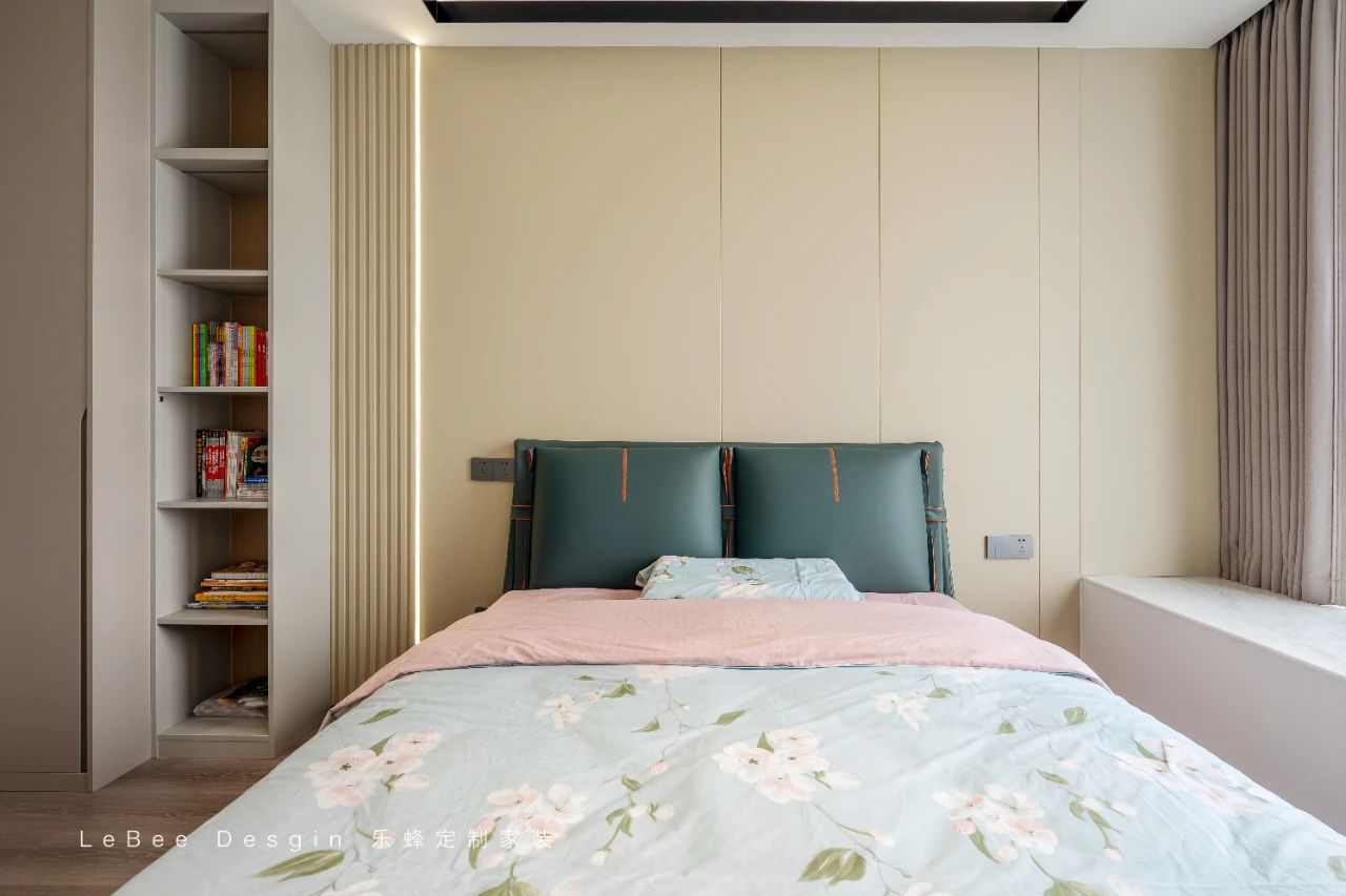 - 兒童房實景圖 - 女孩房的整體設計延續了主臥的風格,營造出統一而和諧的氛圍。其中,那碧綠色的成品床無疑是整個房間的一大亮點,它宛如一顆璀璨的明珠,為空間注入了鮮活而獨特的氣息,使整個房間在保持設計感的同時更具個性。