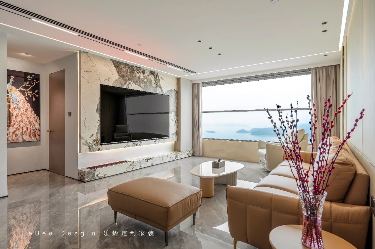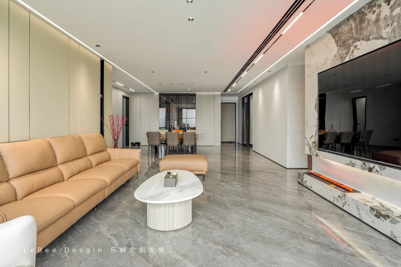 而背景墻大膽采用大氣上檔次的大理石巖板上墻,更是為空間增添了一份奢華質感。同時,深色系的地臺搭配內嵌的地爐,使得整個空間更加豐富且別具韻味,散發出獨特的魅力與格調。