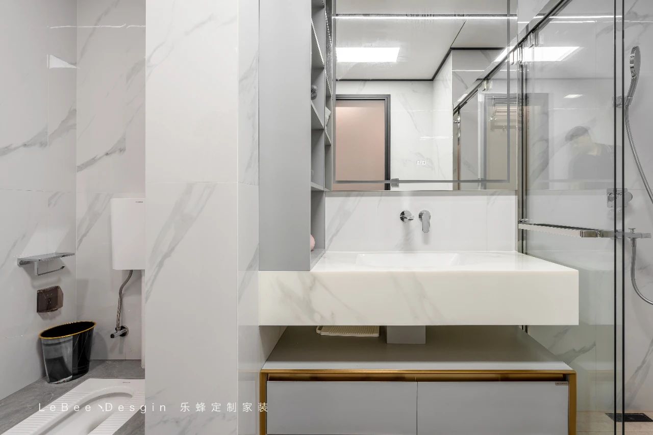 - 衛生間實景圖 - 公衛采用了干濕分離的設計,這種巧妙的設計使得整體空間得以合理規劃,布局更加科學有序。蹲便是應業主的要求所選擇的,體現著業主的喜好與實際需求。中間還有精致的大理石巖板洗手臺,展現出優雅的質感與格調。