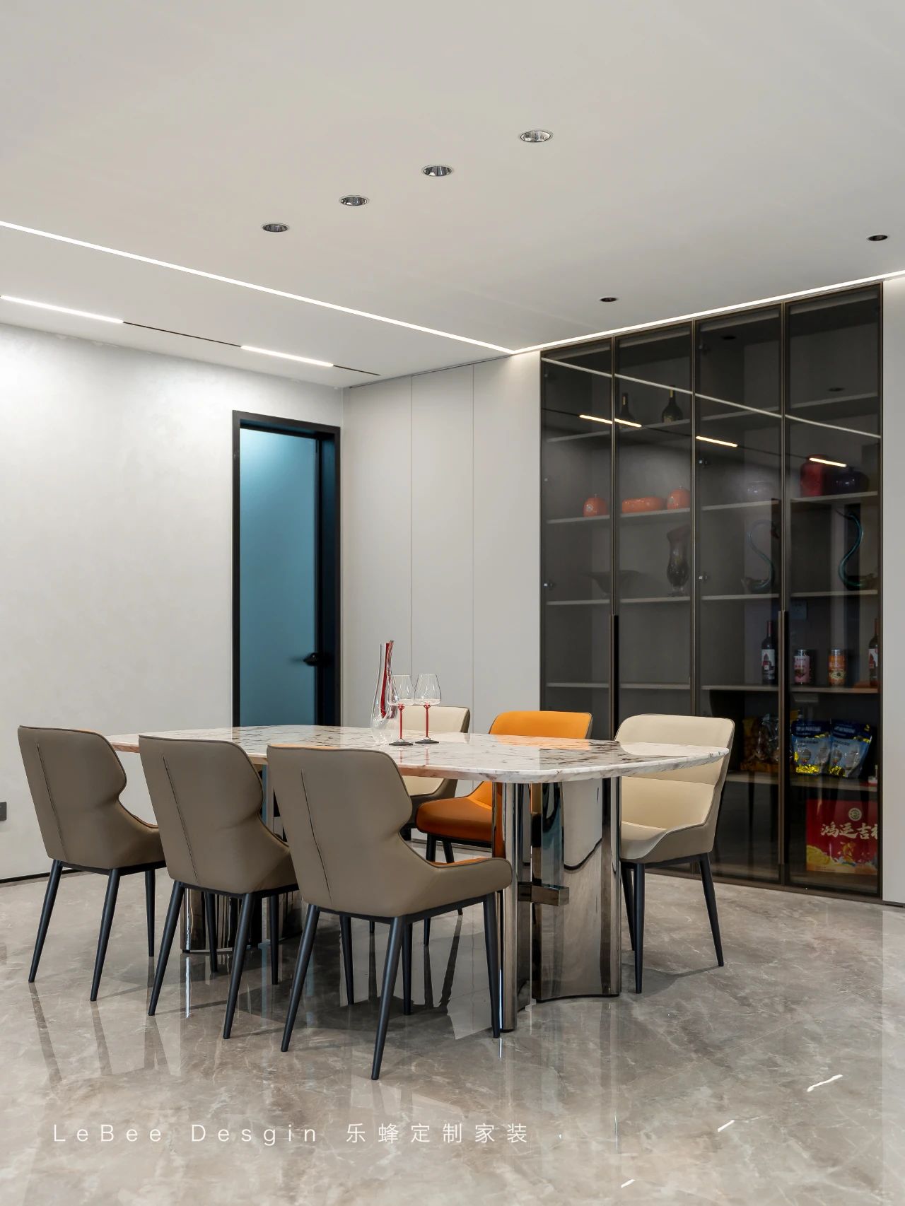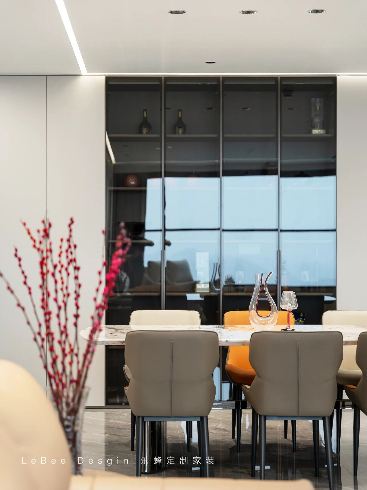 而那精心設計的一門到頂的餐邊柜,將酒柜與開放格完美融合,并創新性地采用長虹玻璃門的設計,更是為整個空間悄然增添了一份獨有的精致與別樣魅力,將現代輕奢風展現得淋漓盡致。
