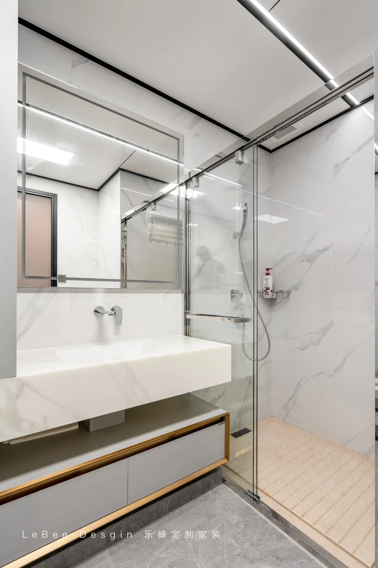 長虹玻璃鏡柜不僅實用,而且為空間增添了一份獨特的美感。此外,濕區配備的地軌推拉門也為整個公衛增色不少,它在實現功能分區的同時,也為空間帶來了一定的裝飾性,讓公衛在實用與美觀之間達到了良好的平衡。