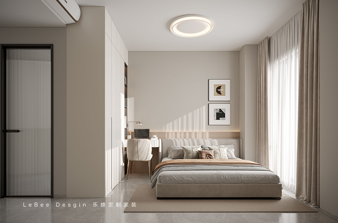 臥整體淺色系為主,考慮到方便實用,我們利用窗戶轉角打造一個視野采光超贊的懸浮書桌,底部也打造了無拉手米白色柜子,方便收納。簡單的吊燈和壁畫也為空間添加了一絲溫馨。