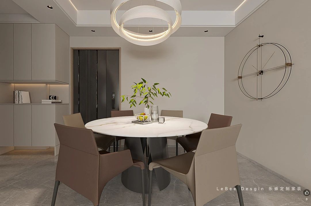 餐廳這邊與客廳相連,大圓桌設計,滿足一家六口的就餐需求,相同色調的餐桌和餐椅,保持了整體風格的連貫性,營造溫馨舒適的用餐環境.