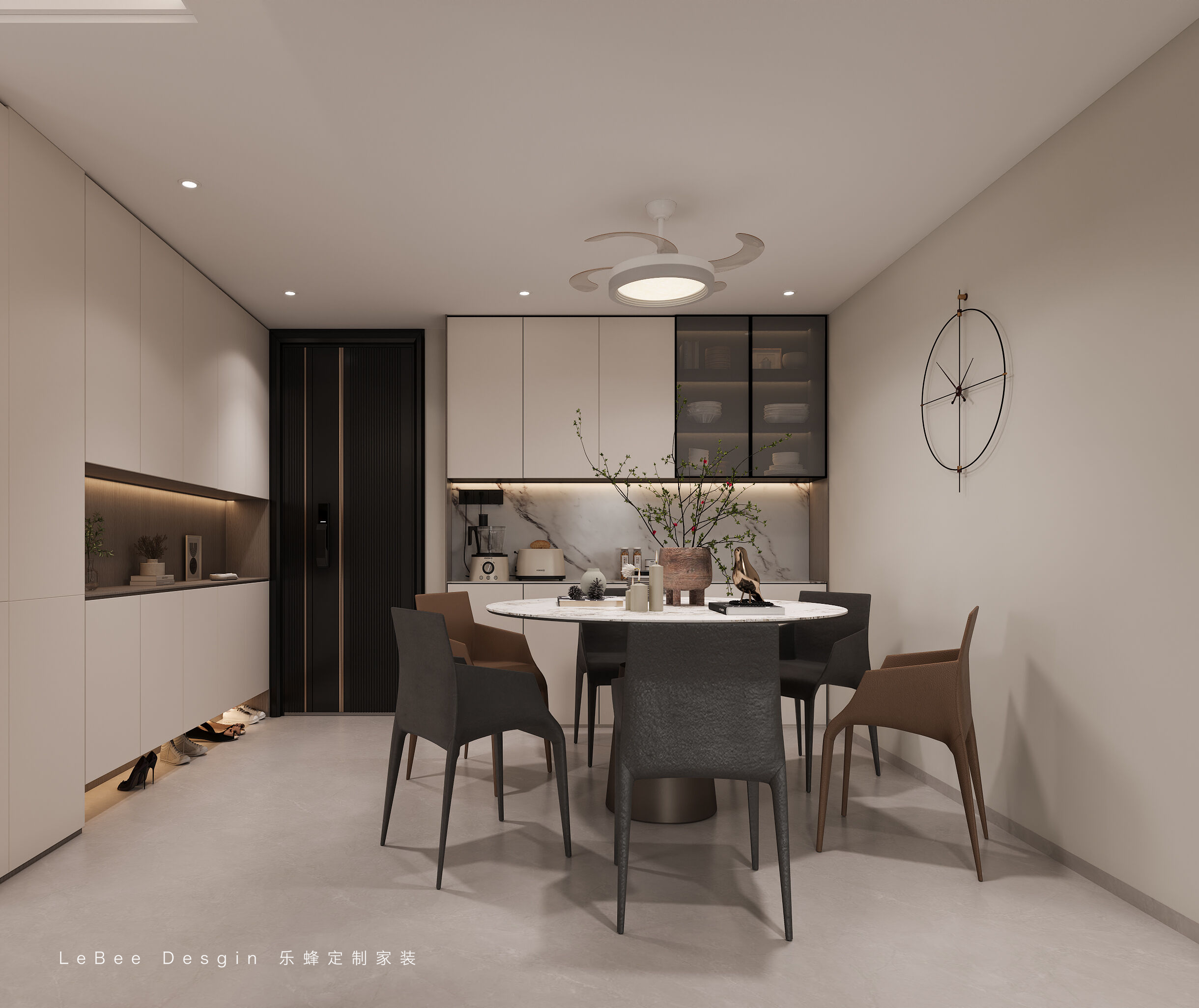 由于女業主頗為注重收納功能與舒適度,在一旁沿著墻體規劃餐邊柜,吊柜同樣為三段式設計。有趣的是,一旁還設置了展示柜,與入戶柜不同的是,中間采用巖板隔斷,不僅增添了整體的視覺效果,搭配大理石巖板餐桌,更讓整個空間顯得格外溫馨。