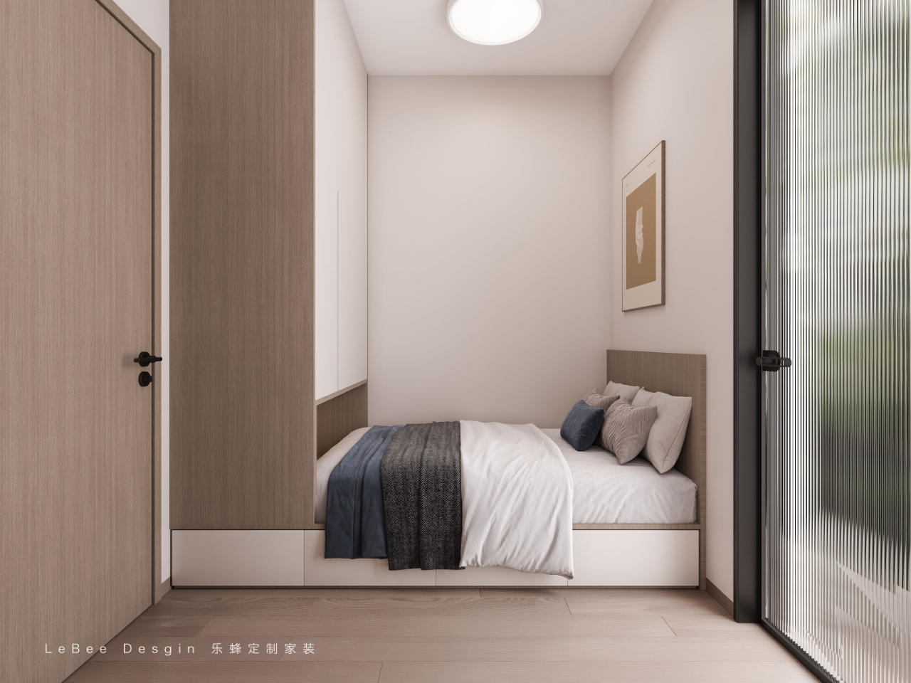 設計小細節:房間小就采用無主燈設計、雙眼皮吊頂和簡約吊燈,讓房間更通透敞亮,擁有這樣的主臥根本不想出門。