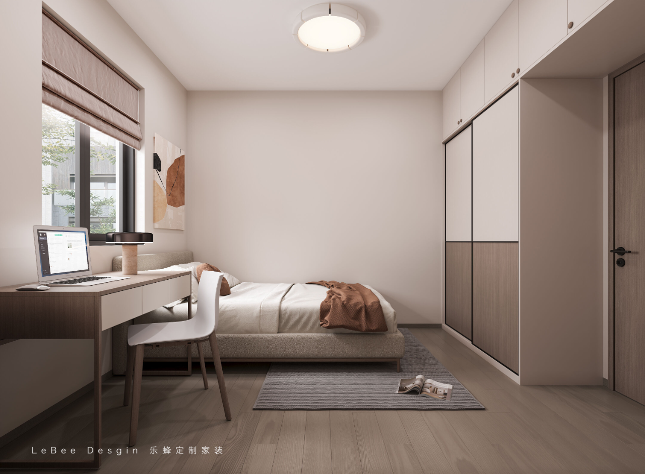 色彩搭配應選擇溫馨柔和的色調,營造寧靜放松的氛圍,同時搭配簡易的書桌,滿足長輩使用需求。
