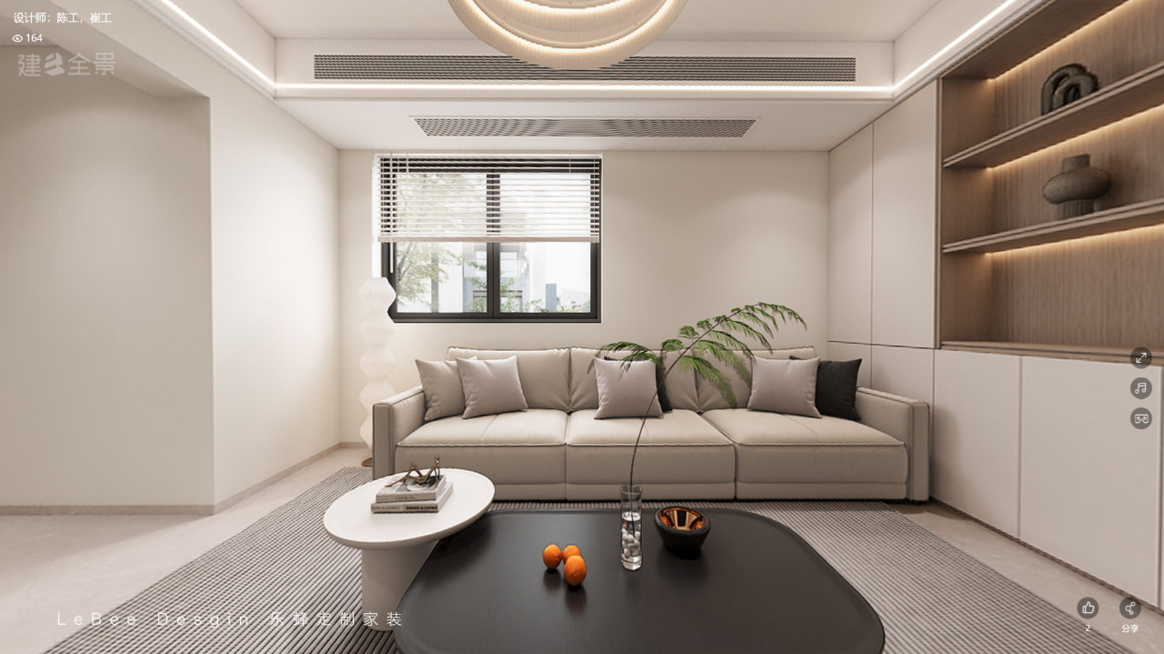 靠墻至陽臺設計 L 形收納柜延至窗臺,內嵌開放格,弧形過渡使空間更順滑舒適,單眼皮吊頂內嵌柔光燈帶。黑白拼接藝術茶幾、淡灰色地毯和簡易藝術燈加以點綴,女主人想要的溫馨舒適和強收納就有啦~