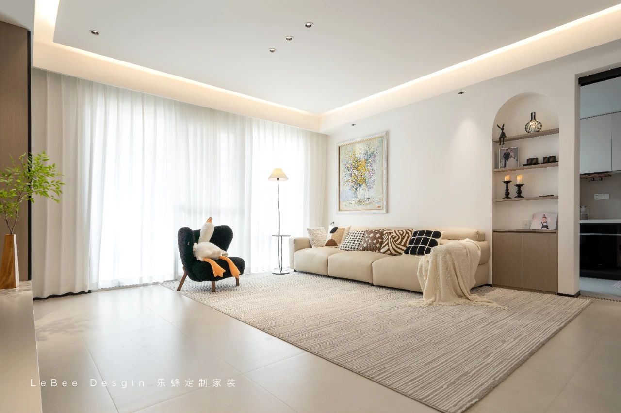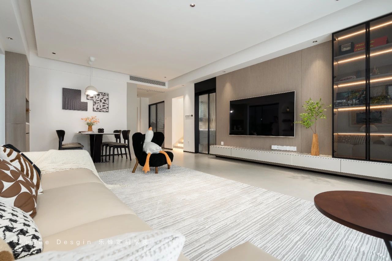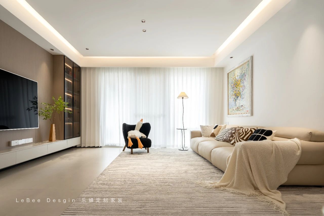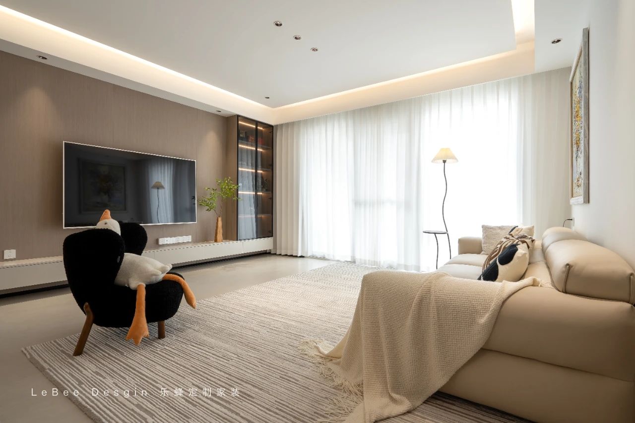 - 客廳空間沉浸在溫暖的色調之中。電視背景墻采用獨具匠心的懸浮式構造,下方精心嵌入的燈帶將溫馨氛圍渲染得淋漓盡致。