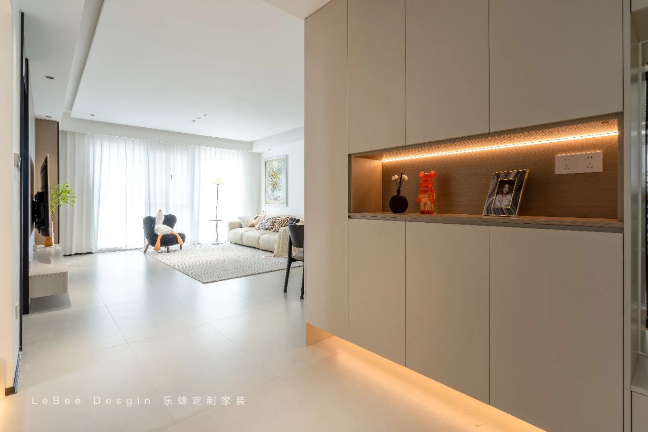 - 入戶打造一門到頂?shù)哪炭占{柜,臨近門的位置巧妙隔斷出懸浮式換鞋凳,其底部預留出充足空間,用于放置日常頻繁穿著的鞋子。