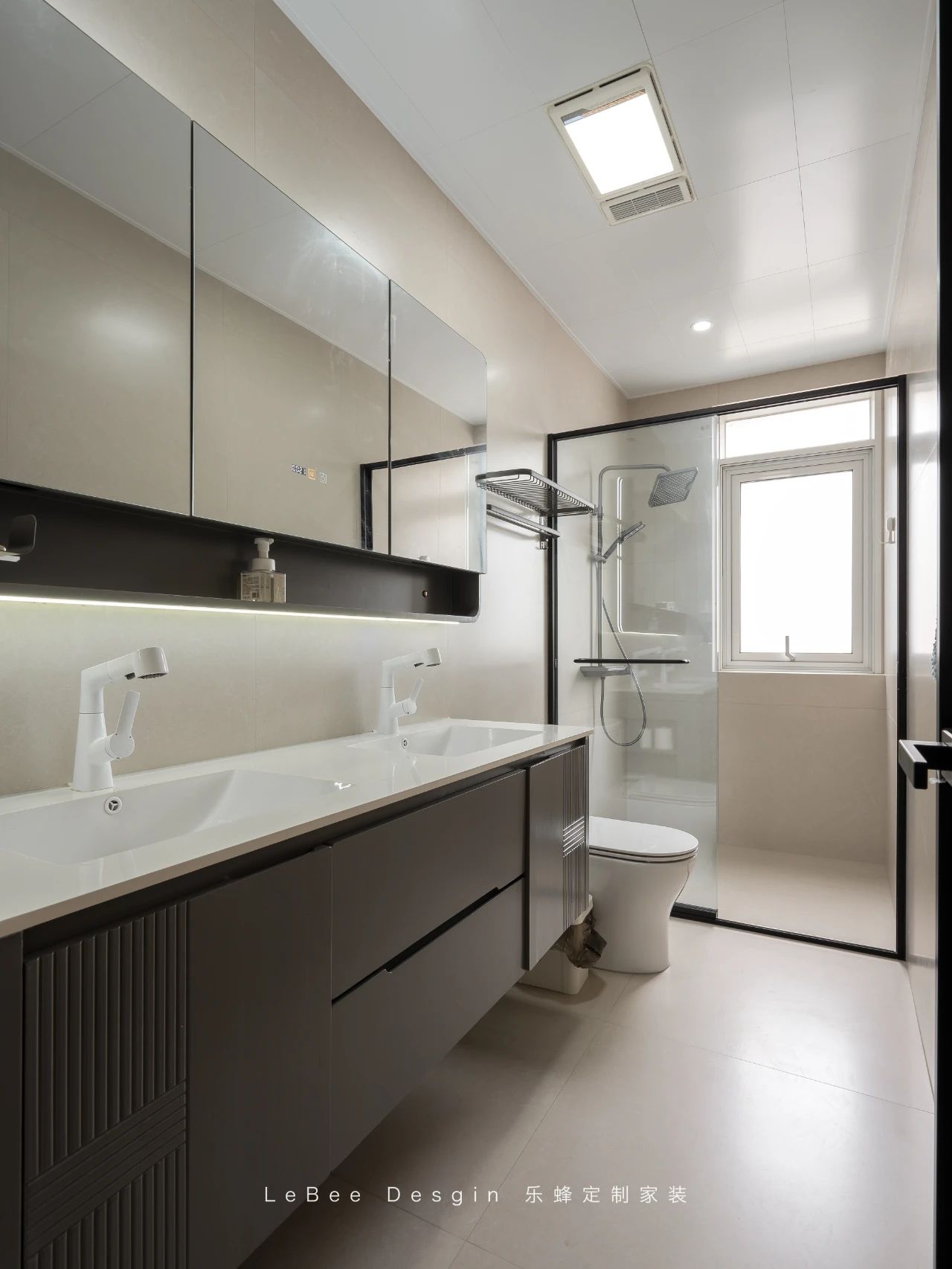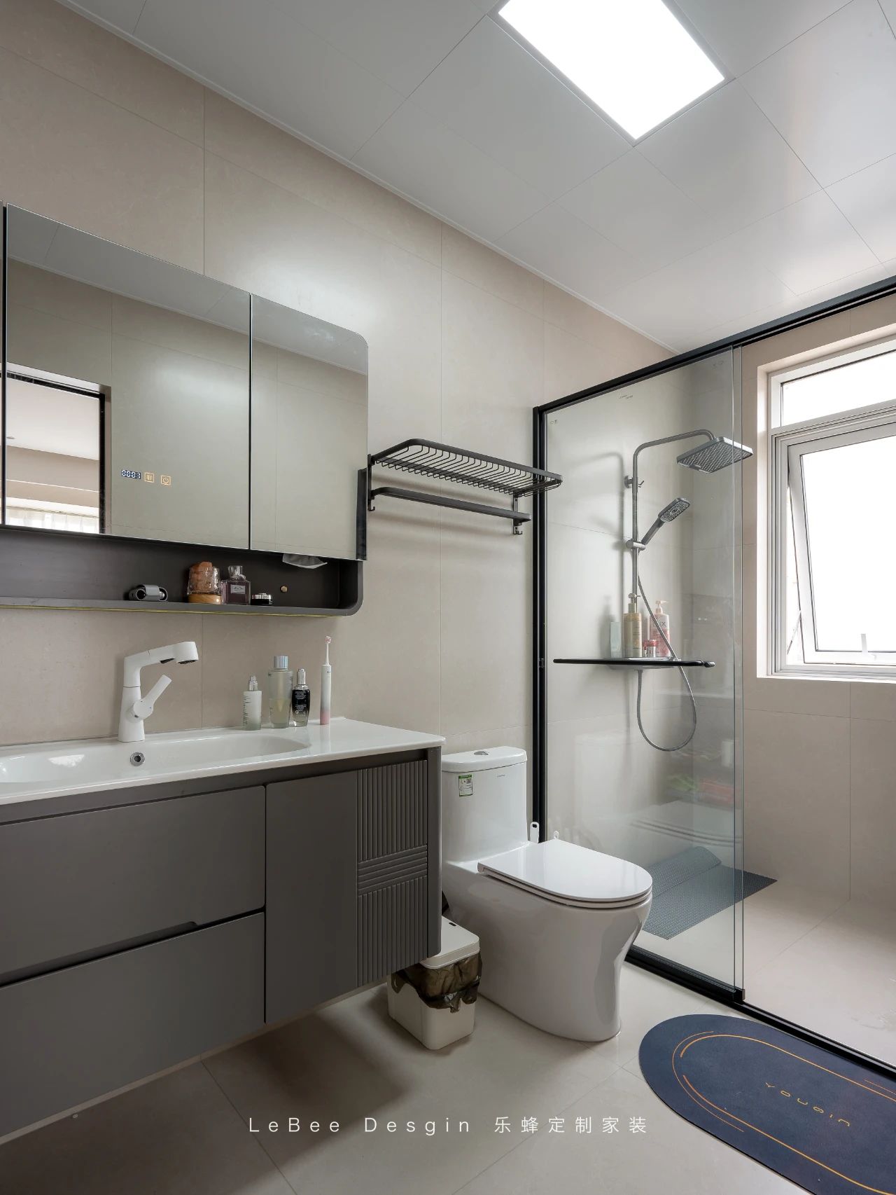 色彩以白為主,配灰色,材質用防水瓷磚和木材。照明燈帶與吸頂燈結合,通風設備佳。實現(xiàn)功能分離,簡約舒適,帶來愉悅衛(wèi)浴體驗。