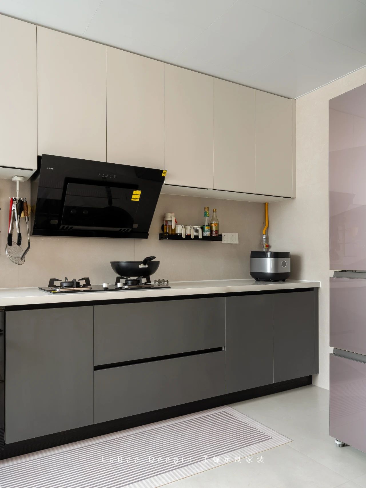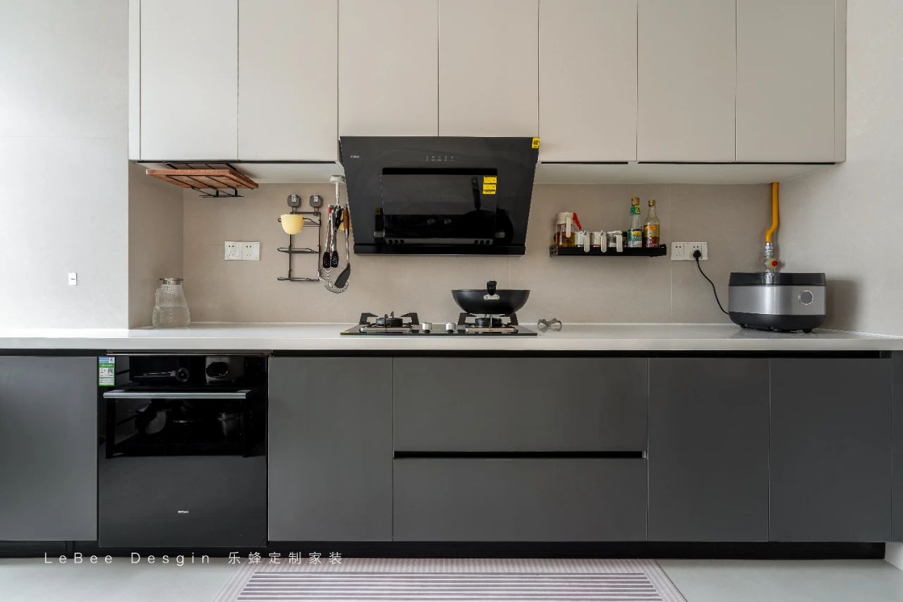 - 廚房實景圖 - 廚房內部采用白色吊柜櫥柜,深藍色地柜內嵌洗碗機,無拉手的設計,操作臺上擺放著各類精致廚具,充滿生活韻味。