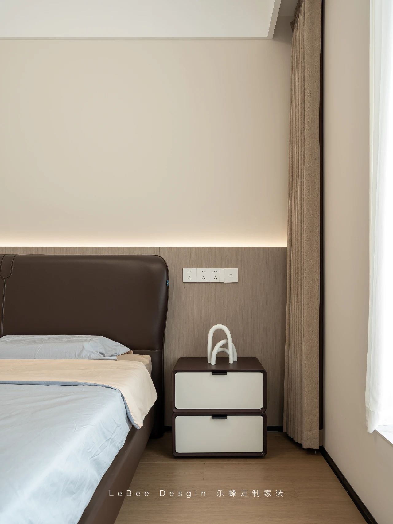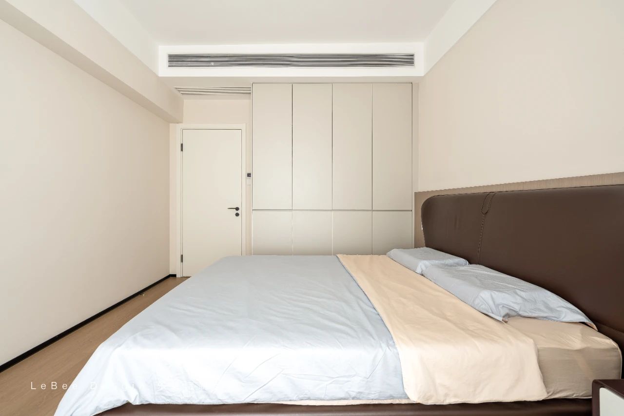 床尾擺放著米白色的一門到頂定制柜,簡約大氣又極具實用性。一旁還精心設置了一個可充當床頭柜的梳妝臺,其精致的設計與整體風格相得益彰。
