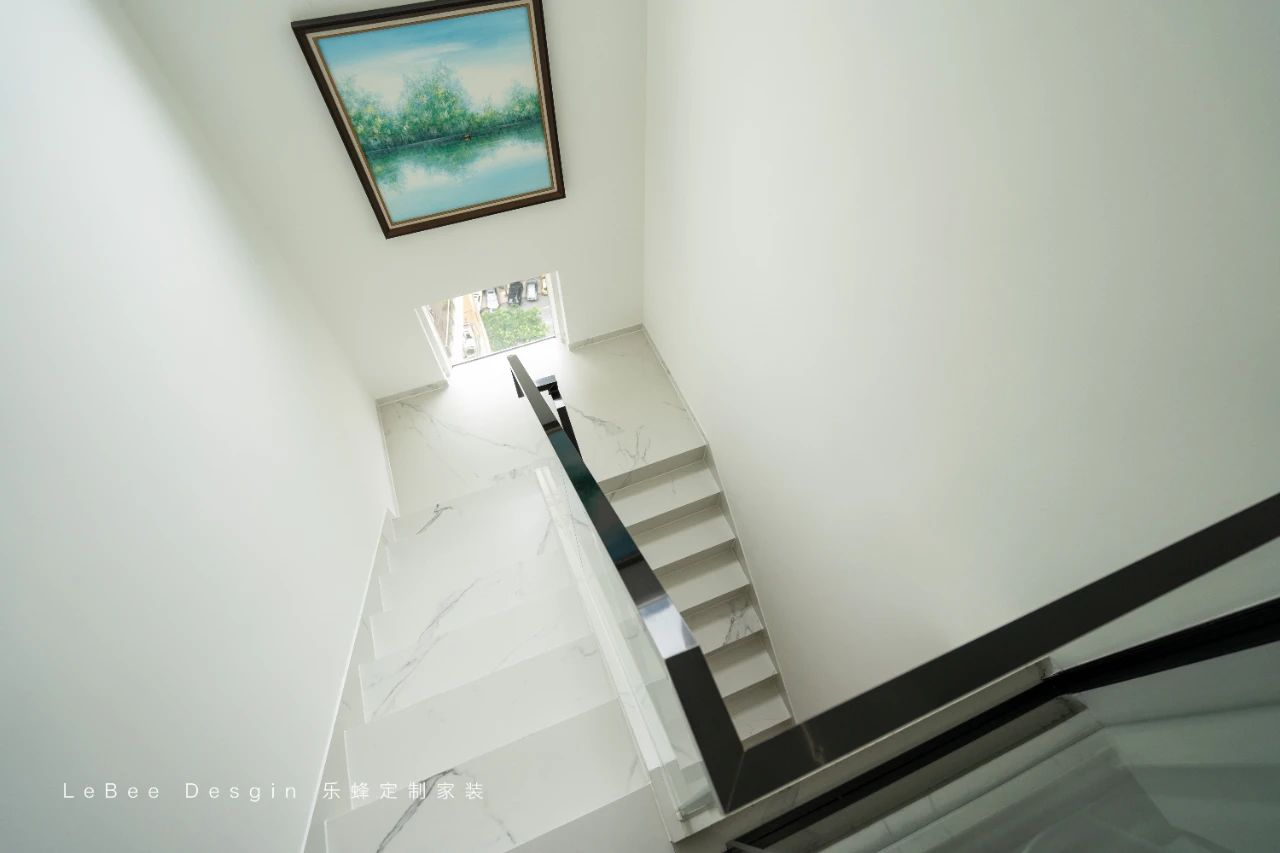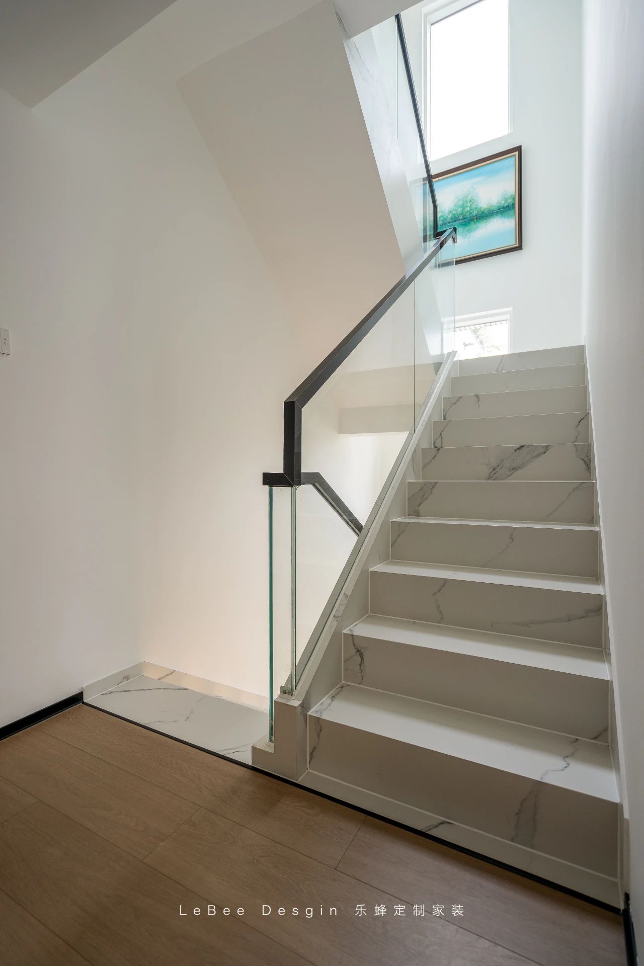 - 樓梯實景圖 - 在這扶手是透明鋼化玻璃配黑色金屬邊框,時尚又通透。側墻是奶白色護墻板,有簡約線條和壁燈。