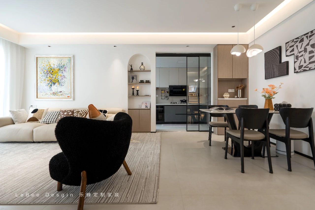 無主燈設計的運用進一步提升了空間的通透感。客餐廳鋪滿大理石地磚,搭配灰色地毯,層次感分明,于簡約質感中不失精致韻味。