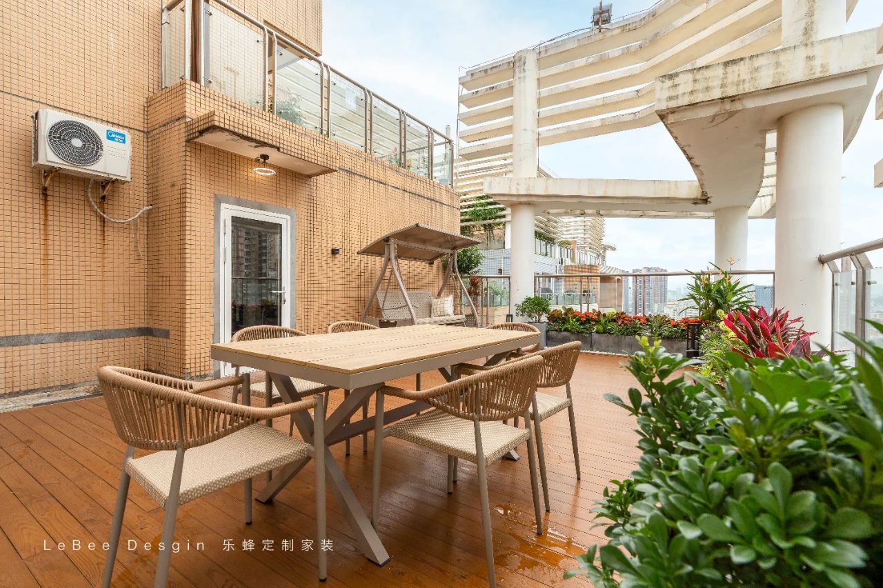 - 天臺實景圖 - 客廳空間沉浸在溫暖的色調之中。電視背景墻采用獨具匠心的懸浮式構造,下方精心嵌入的燈帶將溫馨氛圍渲染得淋漓盡致。
