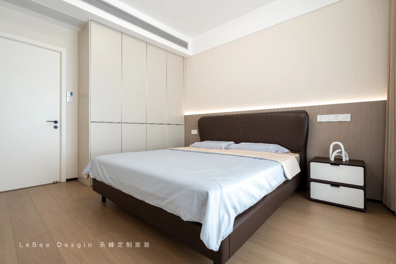 懸浮式的吊頂造型獨特,其中內嵌著柔和的燈帶,當燈光亮起,溫暖的光線均勻地灑落在房間的每一個角落,讓整個主臥空間沉浸在溫馨舒適的氛圍之中。