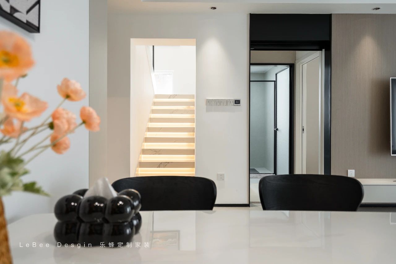 轉角處的風景畫增添清新。從樓上看,樓梯如優(yōu)美曲線,串聯(lián)兩層溫馨生活。簡約風的復式樓里,樓梯仿佛優(yōu)雅的藝術品。踏步由實木制成,涂著奶油色漆,寬度和高度精心設計。