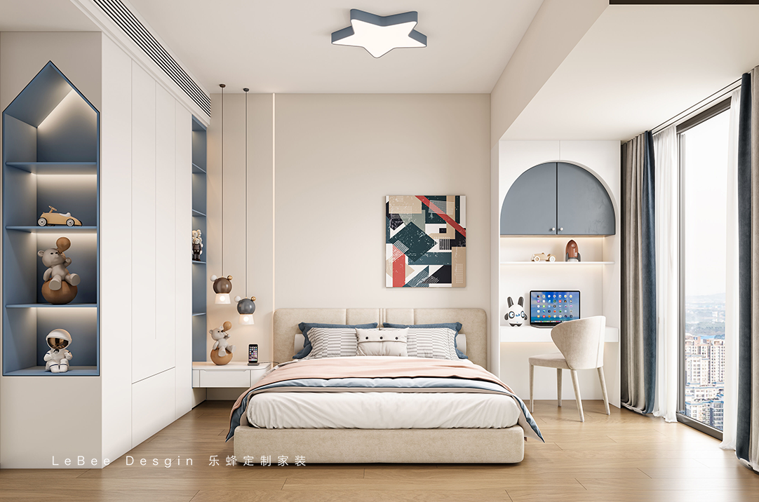 男孩房整體以藍色為主色調,衣柜和床頭柜巧妙地做了一體設計,不僅節省空間,還讓房間顯得更加整潔有序。開放格的設計獨具匠心,方便孩子擺放自己心愛的玩具和書籍?? ,隨時都能拿取。