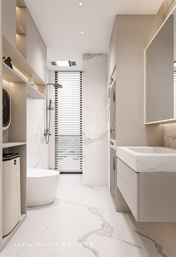 空間利用上,我們可以通過巧妙的設計,將洗烘一體機嵌入浴室柜下方,利用墻面空間安裝懸掛式柜子,做開放格設計,讓每一寸空間都發揮最大效用。