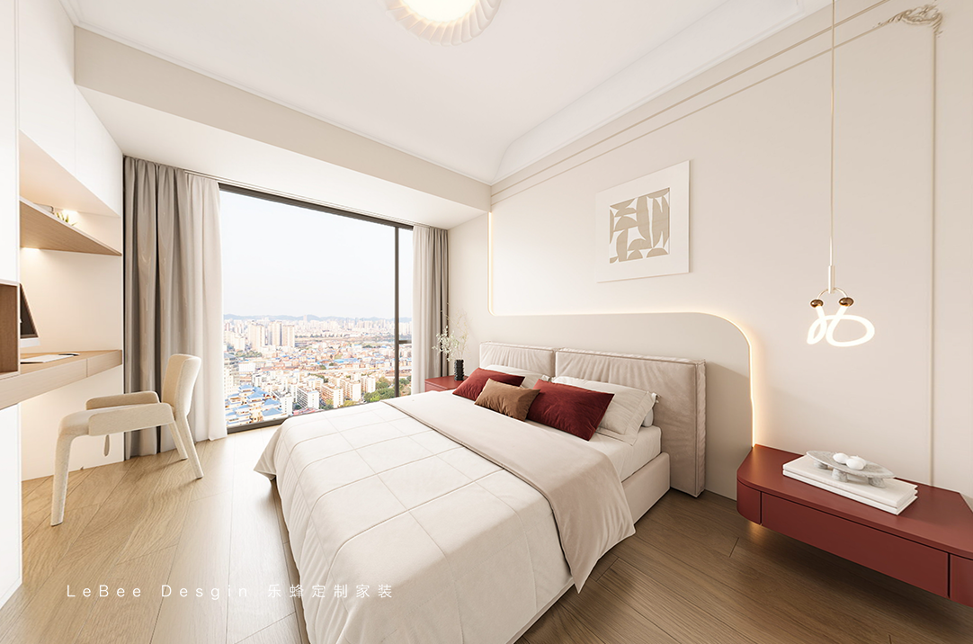 臥室整體色調保持統一,以飽和度低的米白、奶咖、淺駝為主,床頭背景用弧形線條,低飽和木飾面裝飾,搭配隱藏燈帶,給人一種溫潤靈動的感覺的同時,也增加空間層次感。