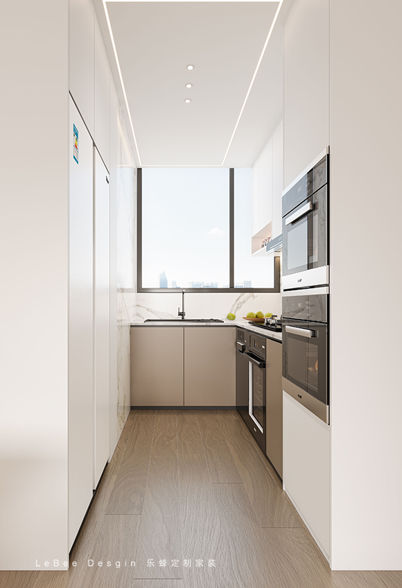 廚房采用推拉門的設計,U型的廚房設計,空間布局包括灶臺、洗菜區、備菜區、冰箱、烤箱、櫥柜收納等。動線明確!