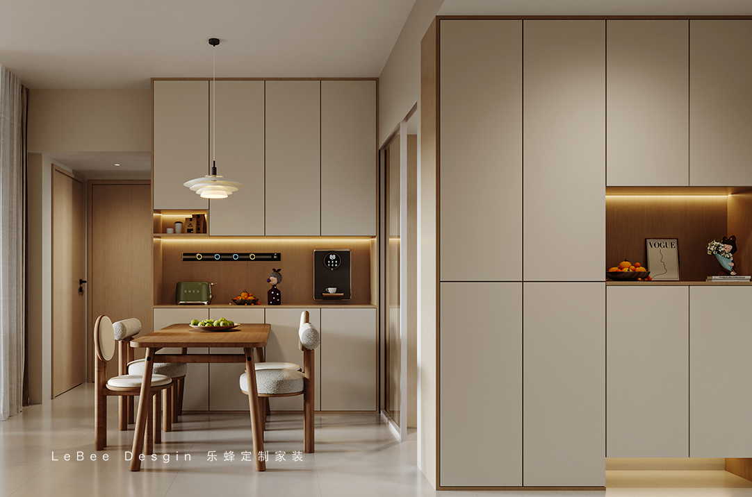 本案例業主想做原木風格,我們設計師根據需求,把小戶型打造得也很開闊舒適,兩房改三房,取消傳統客廳,改造成長輩房,滿足了業主生活空間!整體色調溫馨,用木色點綴提升舒適溫暖的感覺。小戶型在儲物方面很麻煩,所以我們在奶油原木風格上做了滿墻柜子。原木風強調自然、溫馨和舒適的氛圍。它將原木的質感和紋理與簡潔、流線型的設計相融合,創造出具有溫暖感的空間。