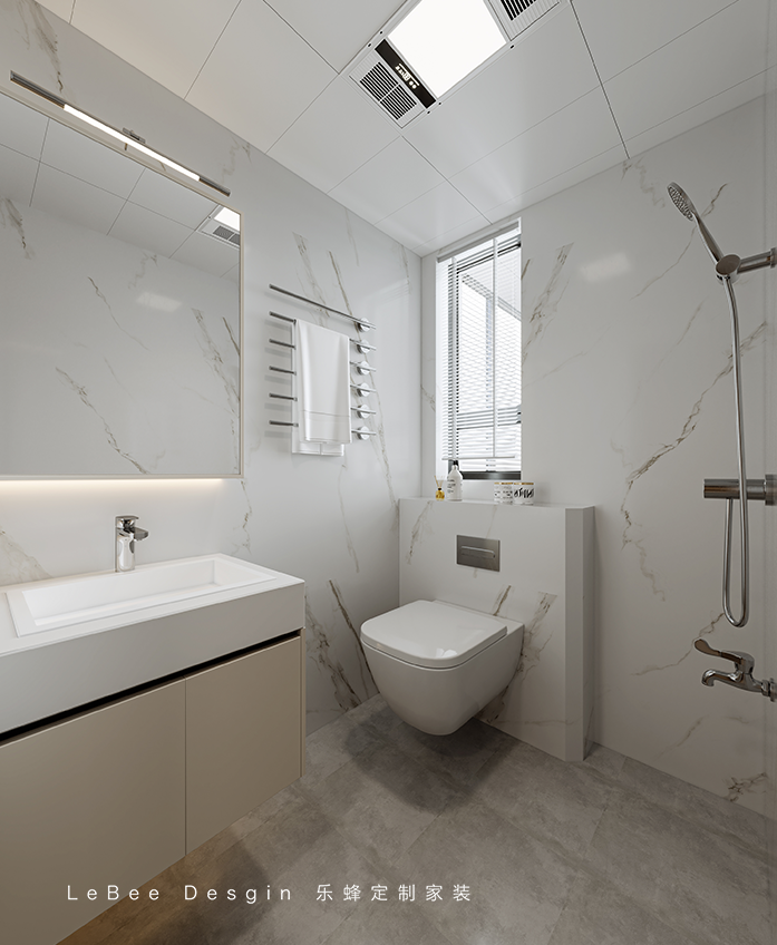 衛生間的墻面同樣采用了與整體風格相符的米白色瓷磚,雖然沒有明確的干濕分離區域劃分,但通過合理的布局實現了功能分區。馬桶設置在一角,旁邊放置了一個小型的置物架,可以擺放毛巾等日常用品。