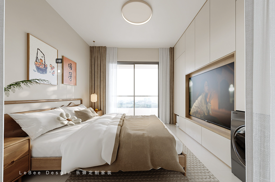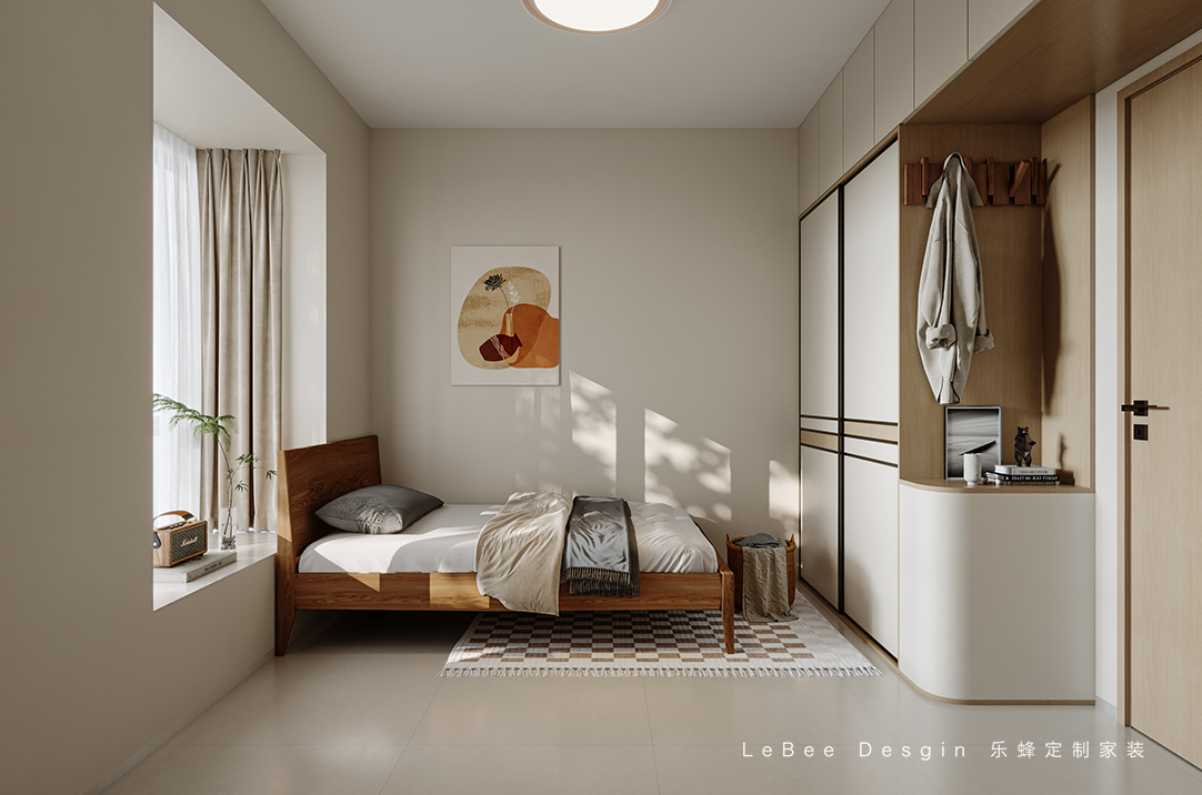 次臥一延續了原木風的設計風格,墻面采用了奶白色的乳膠漆,搭配原木色的床品,旁邊一整排推拉門衣柜,滿足了業主的儲物需求,轉角做了弧形設計,避免磕碰的同時也增加了設計感,上方做了掛勾,可掛置衣物或包包。